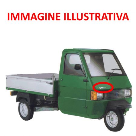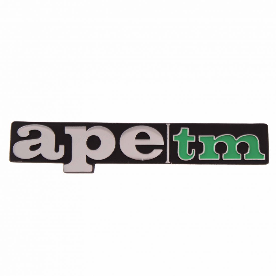 (R.23945) Vendo stemma in alluminio dello scudo anteriore nuovo per Piaggio Ape TM con scritta Ape TM di colore argento e verde su sfondo nero , con larghezza 165 mm e interasse pioli di fissaggio 140 mm , originale Piaggio con codice 569387 , per applicazioni vedere foto , la foto del veicolo è solo a scopo illustrativo