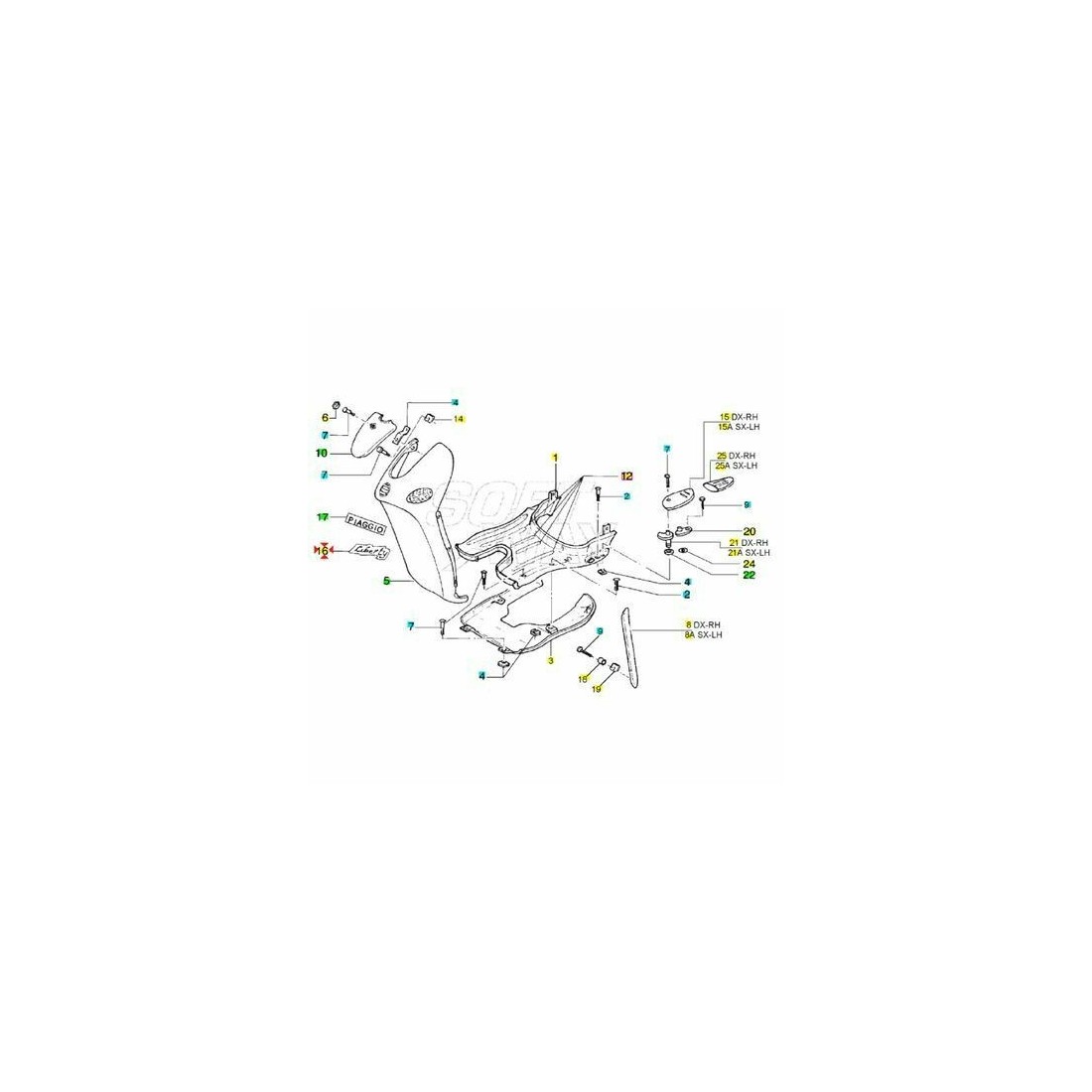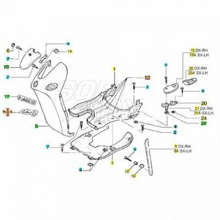 (R.4916) Vendo scritta in plastica su carena frontale nuova per Piaggio Liberty 50 e 125 cc dal 1997 con telai C2800 - C1500 - C37401 - M1100 e codice Piaggio 574480 , per misure con applicazioni ed esploso vedere foto