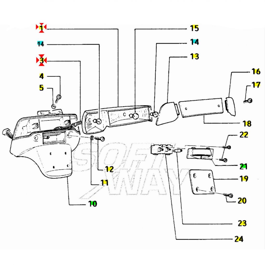 (R.22995) Vendo carcassa fanalino posteriore completo di gruppo cavi nuovo per Piaggio Sfera 50 dal 1994 con codici Piaggio 290943 e 291282 , per applicazioni e spaccato vedere foto