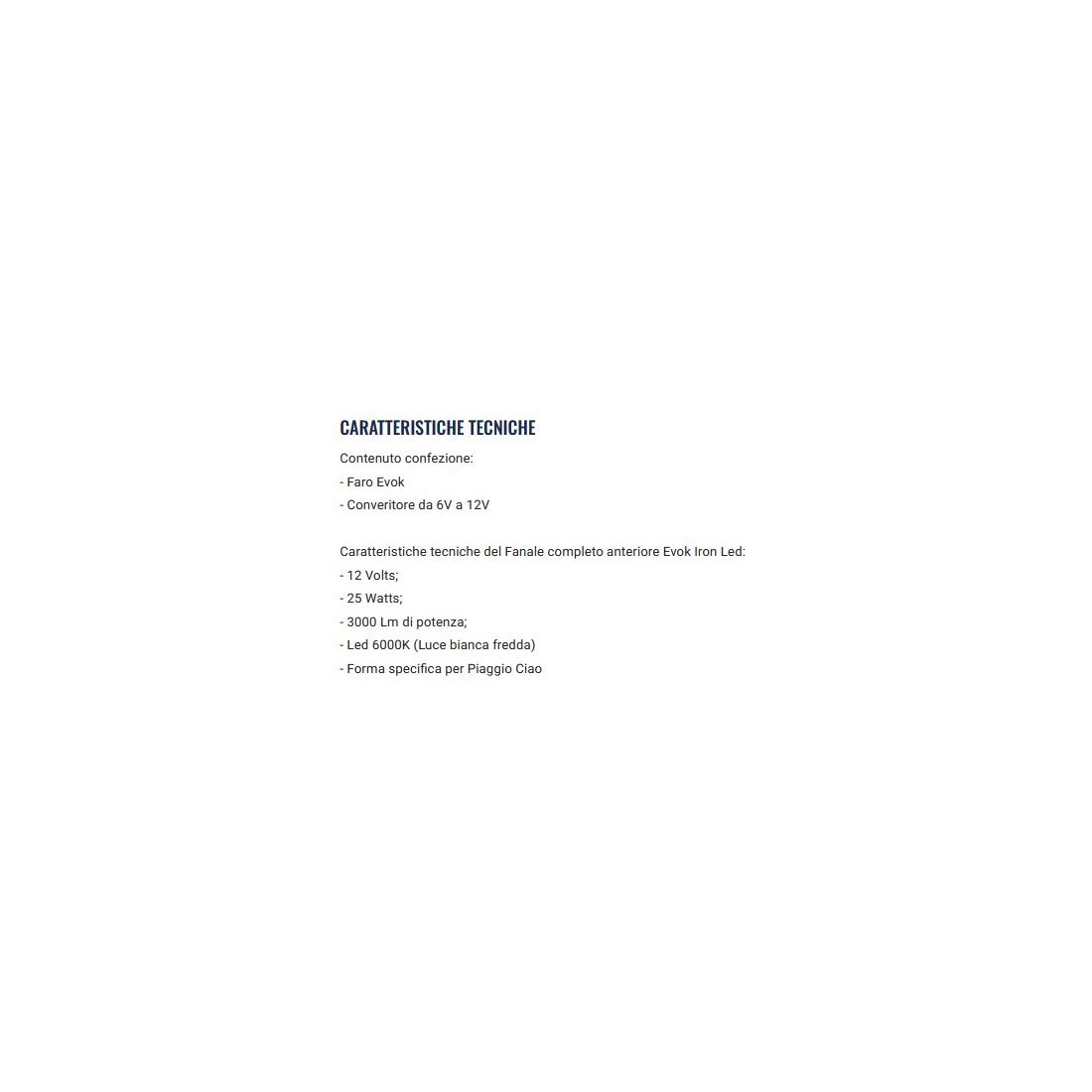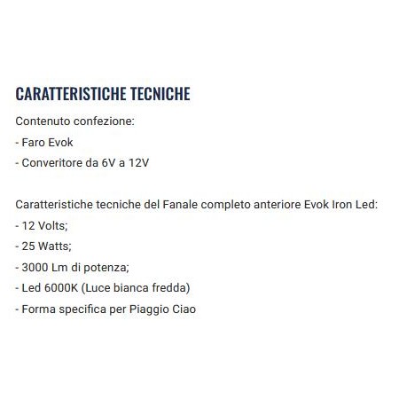 (R.21523) Vendo gruppo ottico anteriore a led nuovo marca Evok Iron con convertitore da 6 volt a 12 volt a 25 watts fino a 3000 lumen con luce 6000 k bianca fredda per Piaggio Ciao e Ciao Mix Teen , per applicazioni e caratteristiche tecniche vedere foto