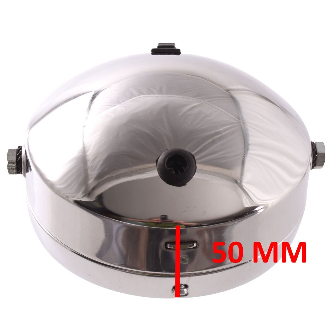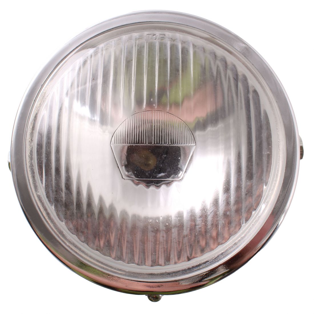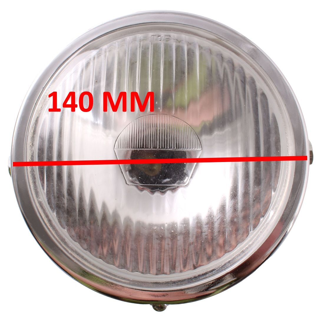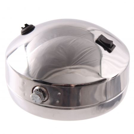 (R.21800) Vendo faro anteriore cromato nuovo con pulsante acceso e spento per ciclomotori vari vintage con diametro esterno del faro da 140 mm e spessore 50 mm cromato , per misure vedere foto