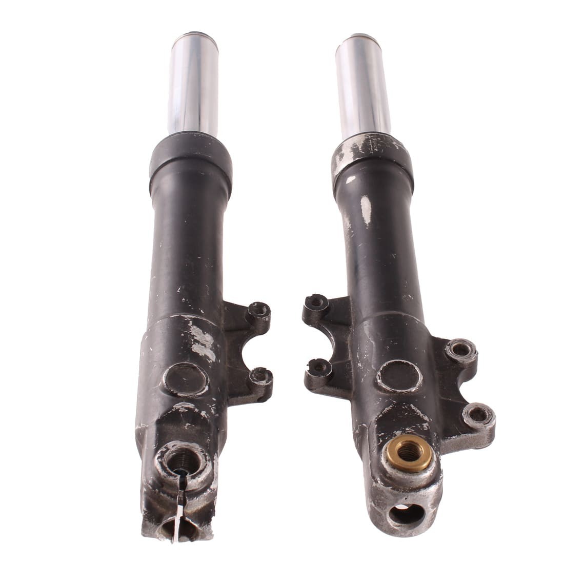 (R.20401) Vendo coppia foderi forcella con steli usati per scooter di cui non conosciamo il modello con diametro steli 32 mm e altezza 390 mm con interasse fori , il prezzo si intende per la coppia , per misure vedere foto