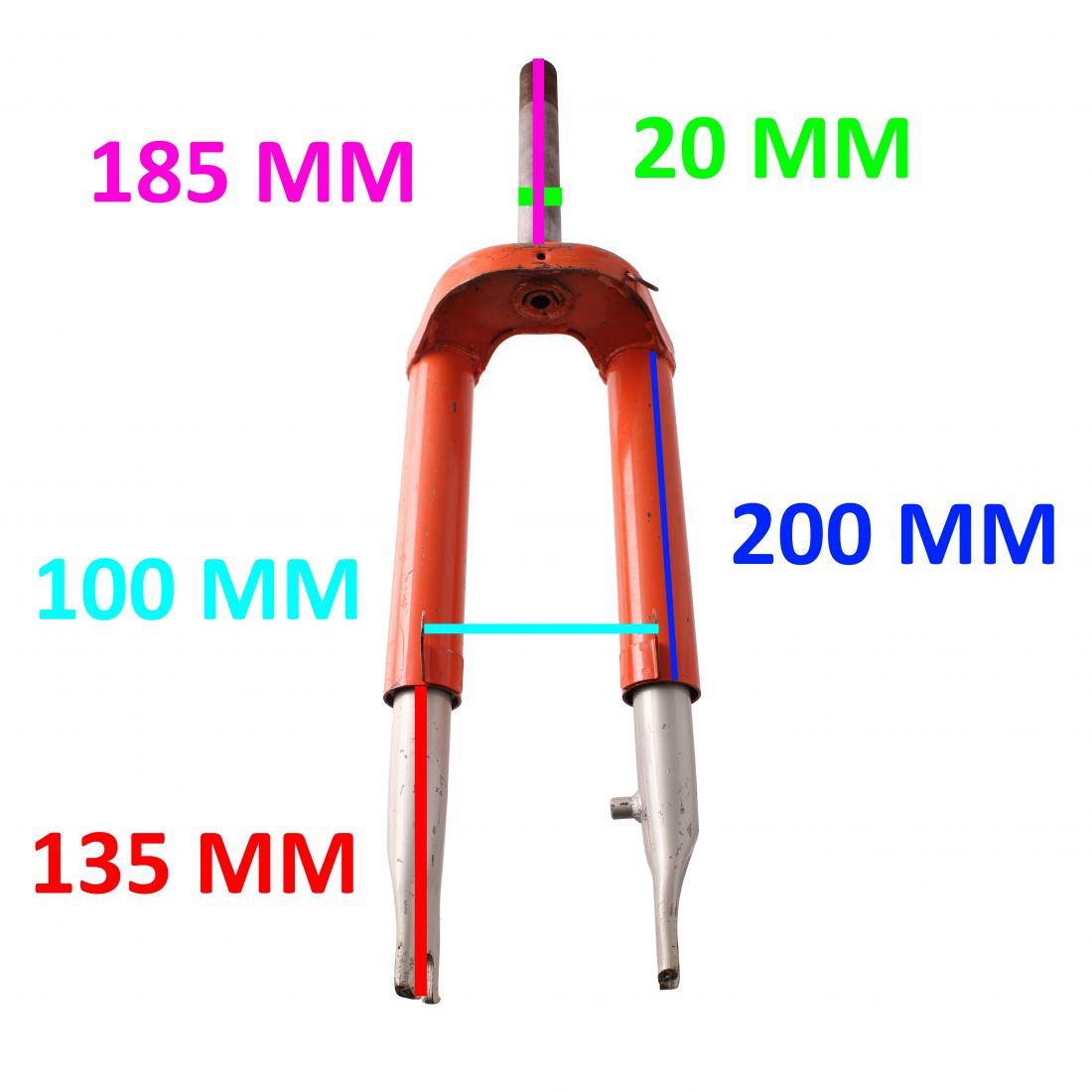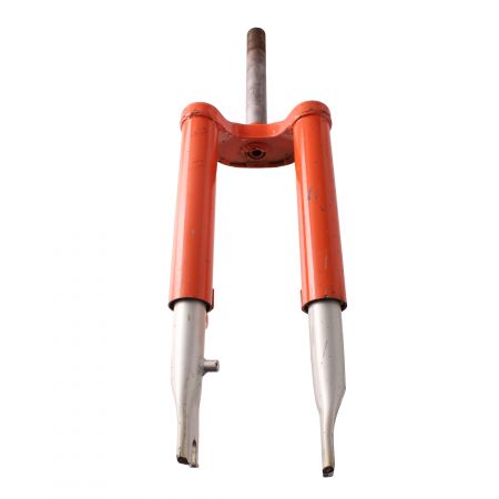 (R. 24861) Vendo forcella nuova con segni di magazzinaggio per ciclomotori vari epoca di cui non conosciamo il modello di colore arancione con canotto forcella con diametro 20 mm. , steli forcella con lunghezza 135 mm. , parte superiore forcella 200 mm. , interno supporti parafango da 100 mm e lunghezza canotto 185 mm , per misure vedere foto