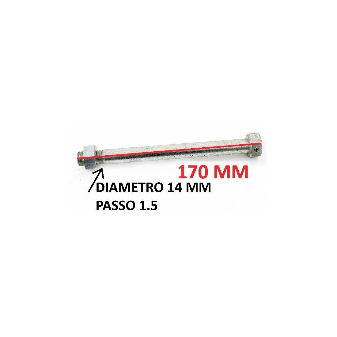 (R.5025) Vendo asse forcellone posteriore nuovo con diametro da 14 mm e lunghezza perno senza testa 160 mm con testa 170 mm e  con filetto da 14 mm con passo da 1,5 destro e codice CBA 50.238.3.00 , per misure vedere foto