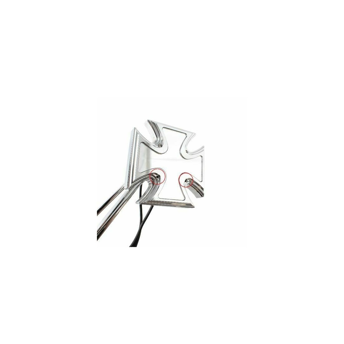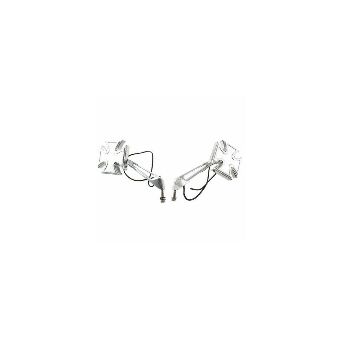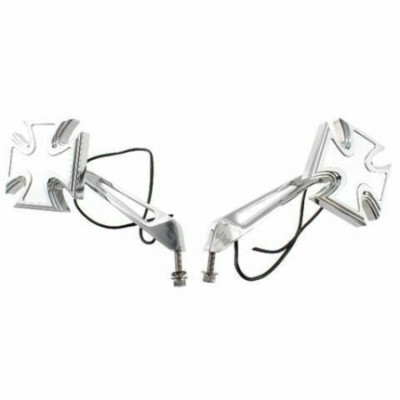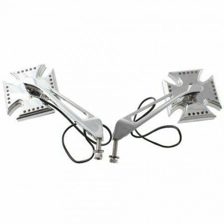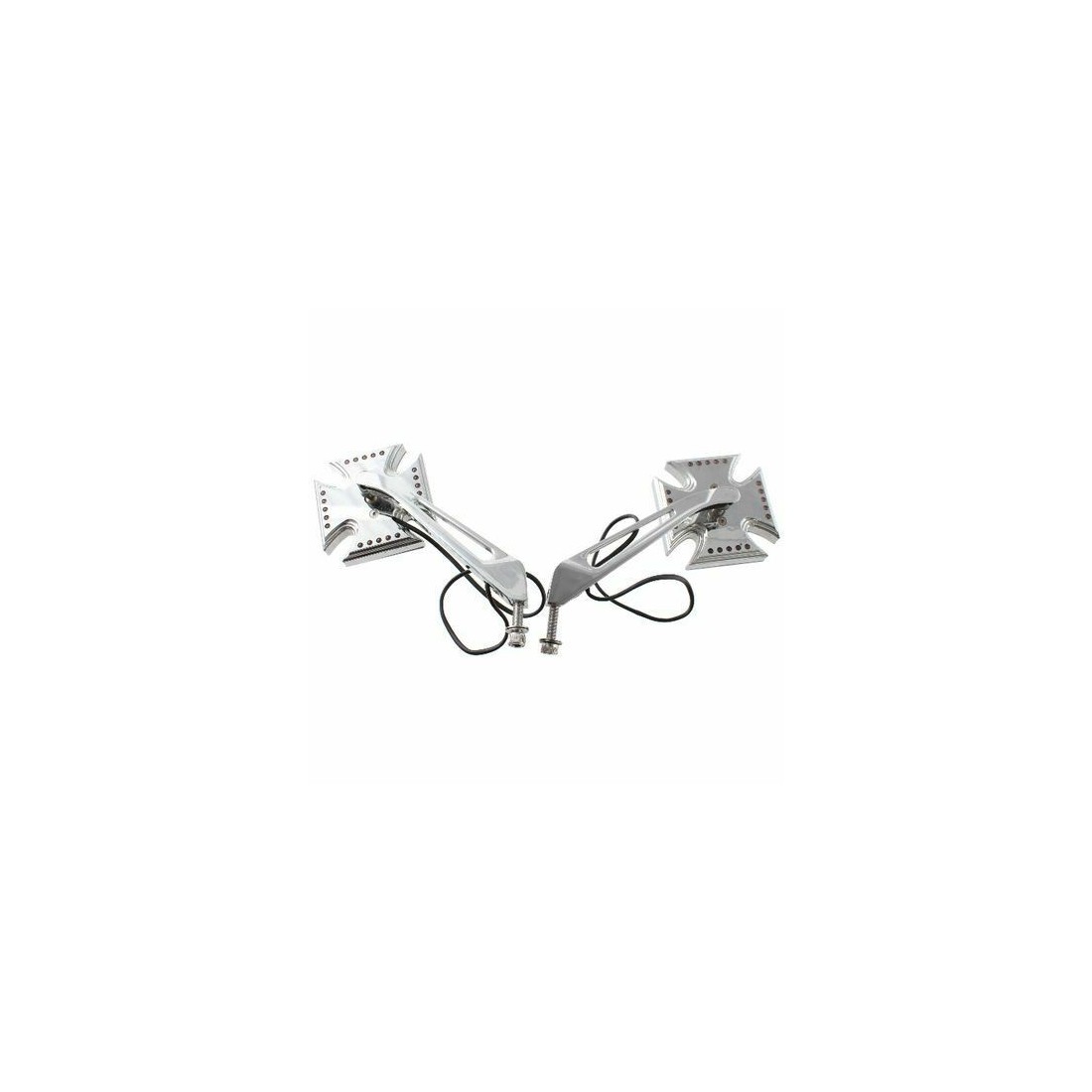(R.12828) Vendo coppia specchietti retrovisori a croce maltese sinistro e destro completi di frecce a LED usati pari al nuovo per moto varie Harley Davidson - Yamaha Royal Star - Stratoliner, Roadliner, Road Star - V Star - Warrior - V,max - Virago di colore cromato , specchio destro mancante di 2 viti di fissaggio come da foto, il prezzo si intende alla singola coppia , per misure vedere foto