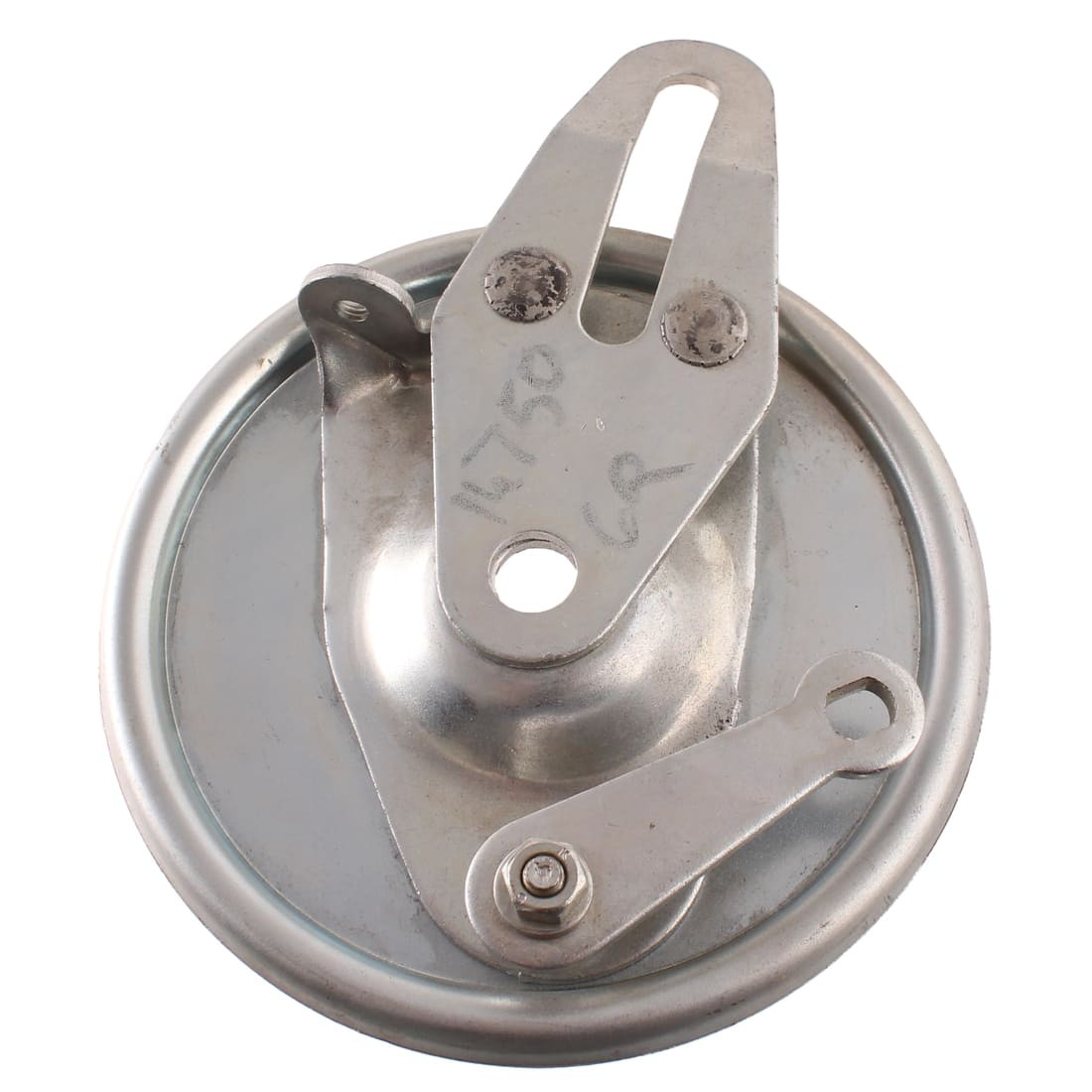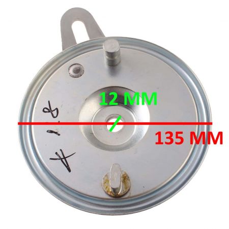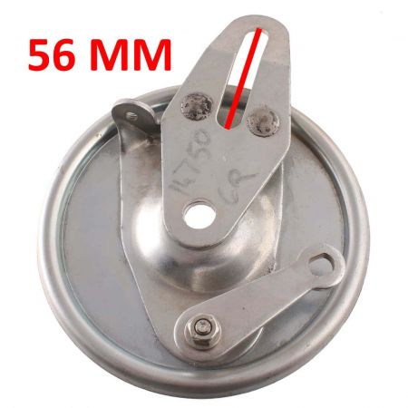 (R.20578) Vendo piatto porta ganasce freno anteriore nuovo per ciclomotori vari vintage con leva comando ceppi , probabilmente con codice Grimeca 14750 con diametro 135 mm foro centrale da 12 mm e foro di innesto 56 mm , per misure vedere foto