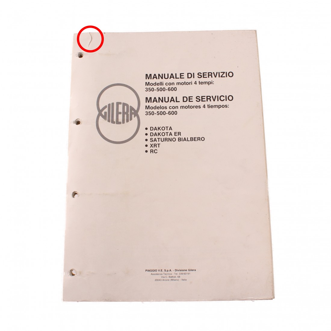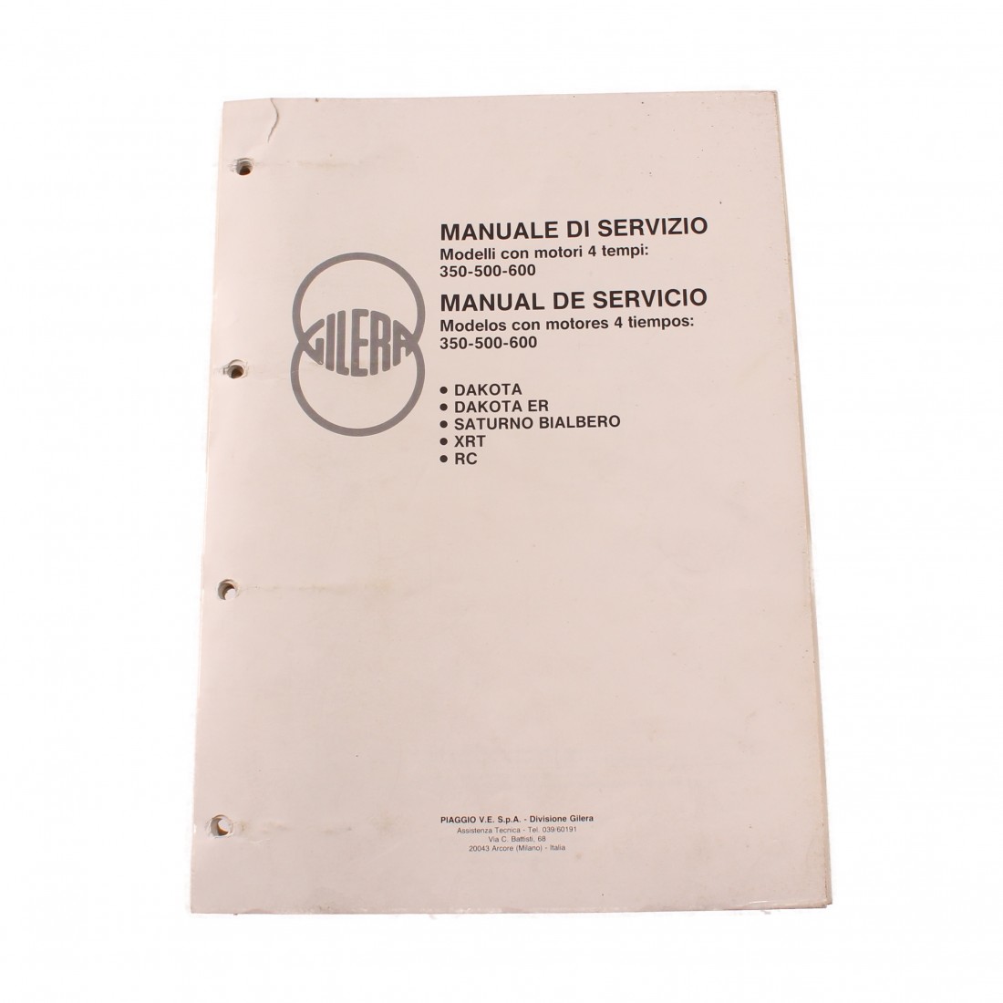 (R.16894) Vendo manuale stazioni di servizio nuovo fondo di magazzino per moto Gilera modelli con motori 4 tempi 350 - 500 - 600 cc - Gilera Dakota - Dakota ER - Saturno Bialbero - XRT - RC in italiano e spagnolo con leggeri segni sulla copertina e sulla prima pagina di magazzinaggio e con interno sano