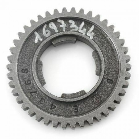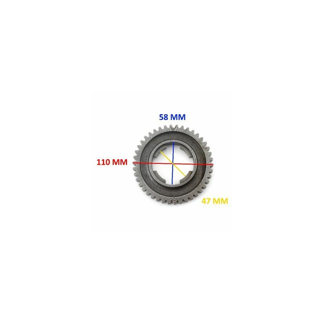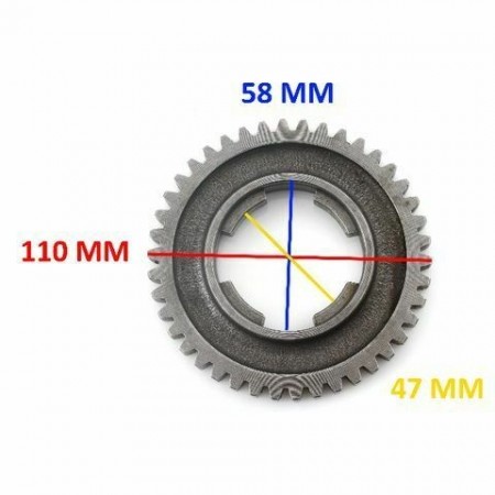 (R.2559) Vendo ingranaggio nuovo della seconda velocità con diametro esterno 110 mm , spessore 12 mm , diametri interni 58 mm e 47 mm , per Piaggio Ape TM P602 dal 1982 per telai atm1t e Ape MP P501 e P601 dal 1978 telaio MPR2 - M2 - V2 e Ape TM P703 e P703V , FL2 dal 1984 per telaio atm2t da denti 42 con codice piaggio 1697344 o 169734 , per misure con applicazioni e misure vedere foto