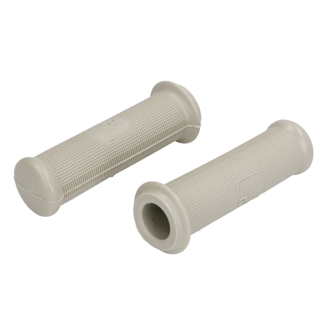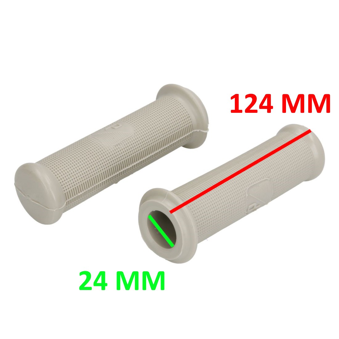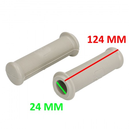 (R.20264) Vendo coppia manopole in gomma nuovo per Piaggio Vespa 150 VLRT (’56) - 50 V5A1T - V5SS1T - 90 V9A1T - V9SS1T - 125 VMA1T - VNA1/2T e VNB12T Primavera (fino al ’78) con logo simile a quello Piaggio rettangolare di colore grigio con foro da 24 mm e lunghezza 123 mm, il prezzo si intende per la coppia , per misure vedere foto