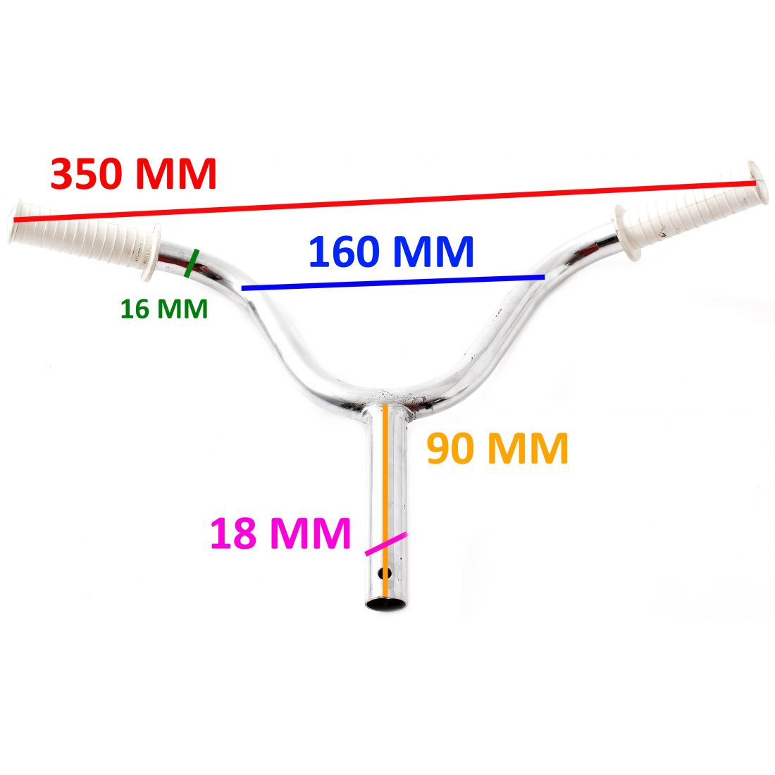 (R.7596) Vendo sterzo nuovo per bicicletta bambino vintage con ruote del 12 completo di manopole e con diametro pipa manubrio 18 mm e ampiezza 350 mm , diametro manubrio 16 mm , con segni di magazzinaggio , per misure vedere foto