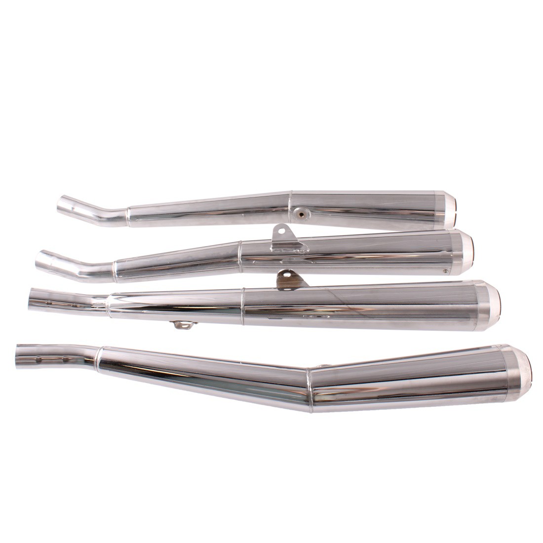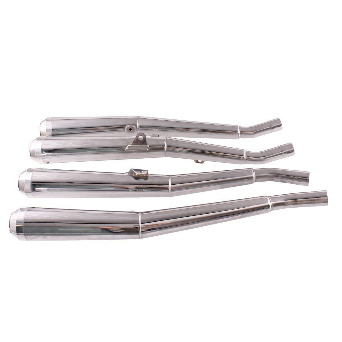 (R.18968) Vendo serie scarichi quattro in quattro nuovi non omologati cromati per Kawasaki Z1 900 cc marca Mecadapo con codice MK900X4 con diametro interno imbocco 38 mm , fondo di magazzino con leggeri segni di magazzinaggio , 1 marmitta con segno di lavorazione come da foto , il prezzo si intende per l'intero kit , per misure vedere foto