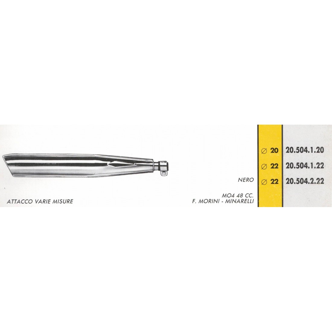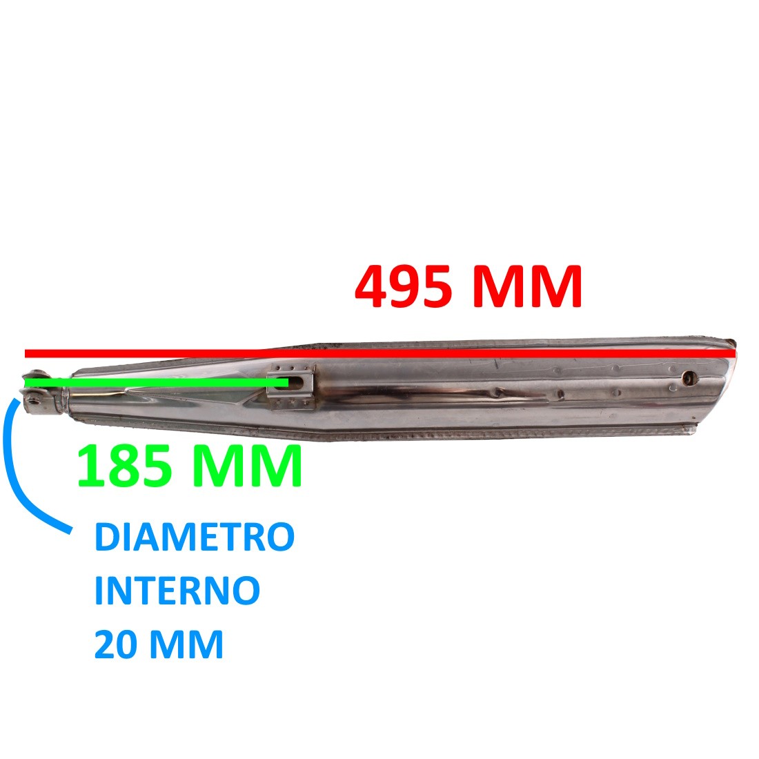 (R.21329) Vendo silenziatore di scarico cromato nuovo per ciclomotori vari vintage con motore Franco Morini MO4 o Minarelli marca CBA con codice 20504120 con diametro interno imbocco 22 mm e lunghezza 495 mm con distanza da attacco 185 mm , per misure e scansione catalogo vedere foto