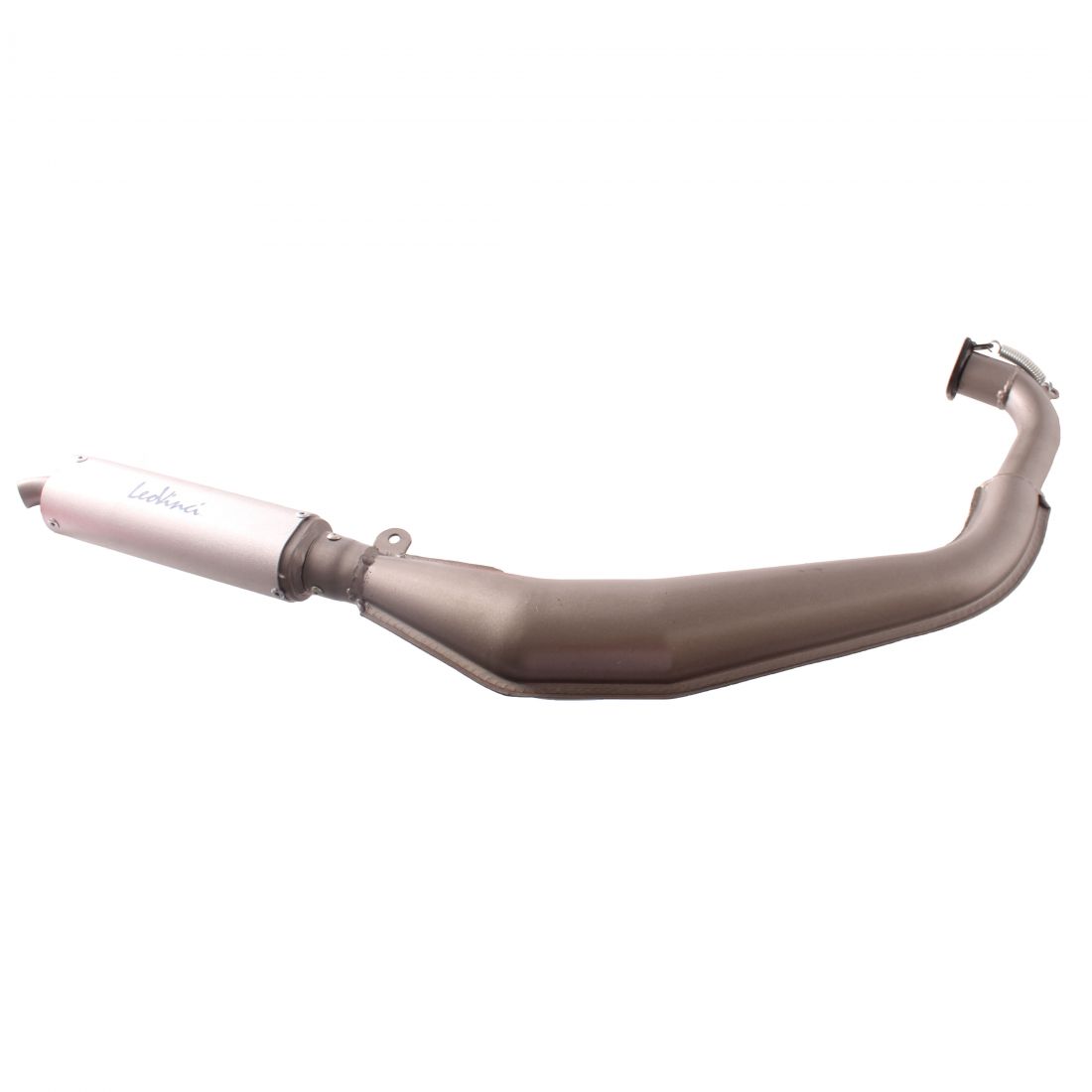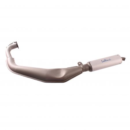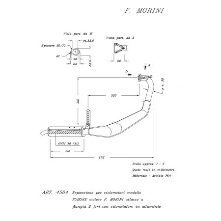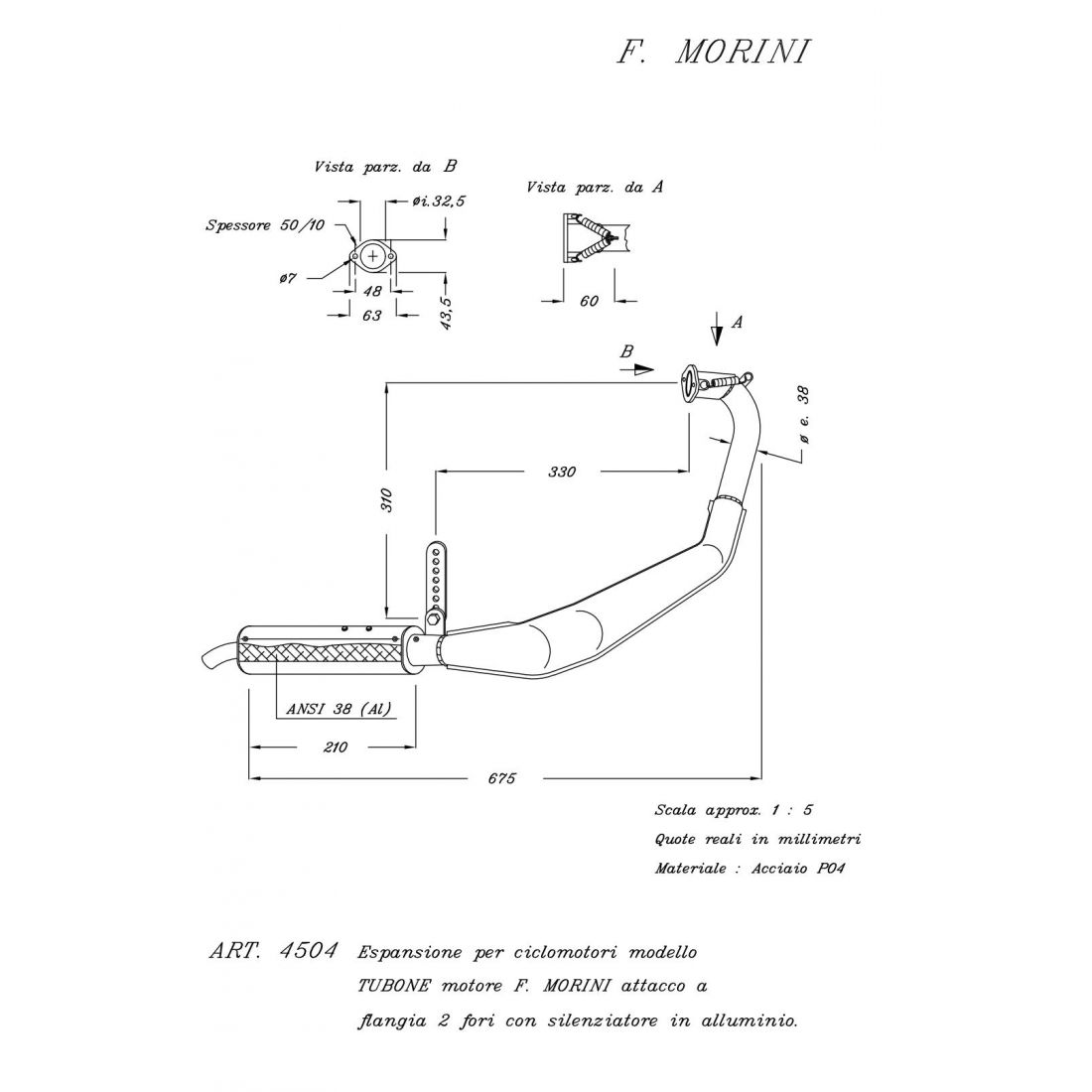 (R.22321) Vendo scarico tipo espansione con silenziatore in alluminio nuovo per tuboni con motore Franco Morini con attacco a flangia 2 fori diritti marca Leovinci con codice 4504 , per misure vedere foto