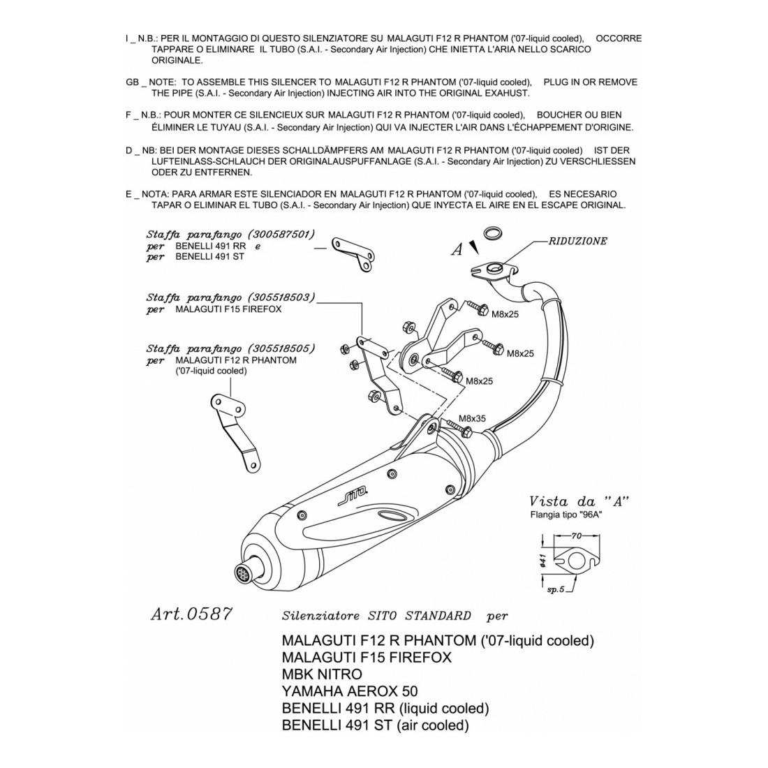 (R.14656) Vendo marmitta nuova per Malaguti F12 R Phantom 50 dal 2007 - F15 Fire Fox 50 cc dal 1996 - Yamaha Aerox 50 cc dal 1997 - MBK Nitro 50 cc dal 1997 - Benelli 491 RR e ST 50 cc dal 2003 marca Sito con codice 0587 di colore nero , per misure vedere foto