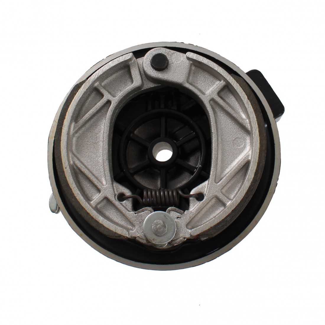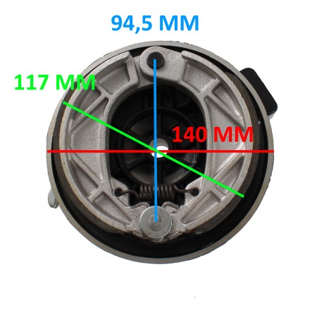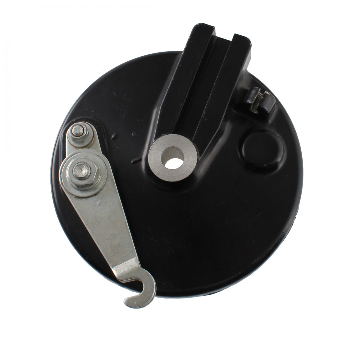 (R.15985) Vendo coperchio portaganasce mozzo freno anteriore nuovo completo di gansce e levetta per moto varie vintage di colore nero con interasse perni ceppi 94,5 mm e diametro esterno 140 mm con diametro ceppi 117 mm con leggeri segni di magazzinaggio , per misure vedere foto