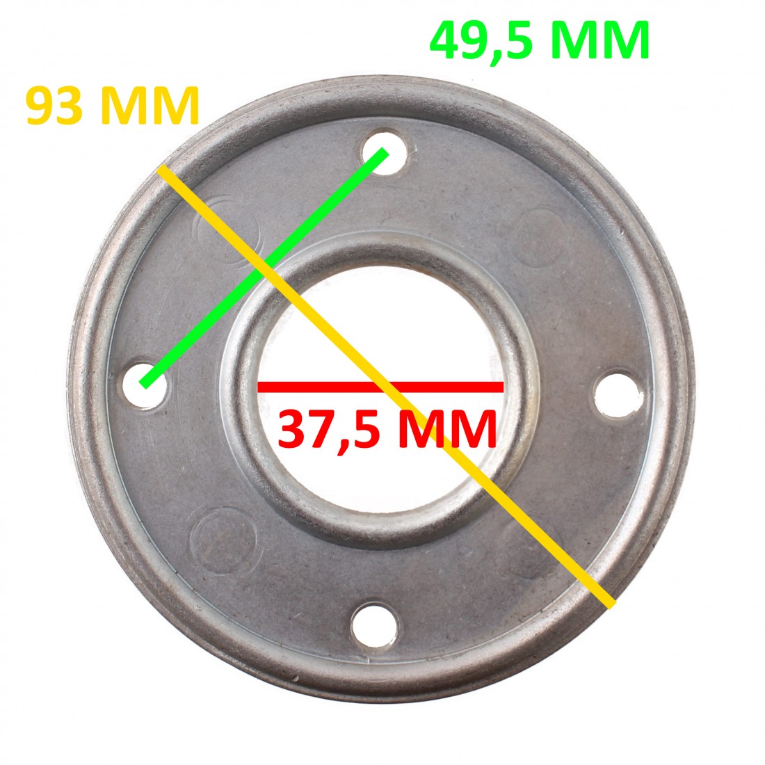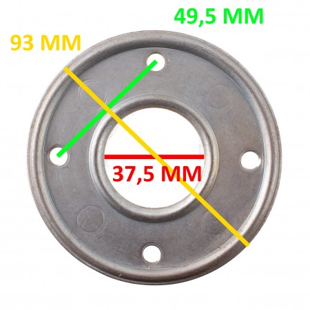 (R.18214) Vendo flangia mozzo ruota nuova per ciclomotori vari vintage con diametro interno foro 37,5 mm ed esterno 93 mm con interasse fori 49,5 mm , per misure vedere foto