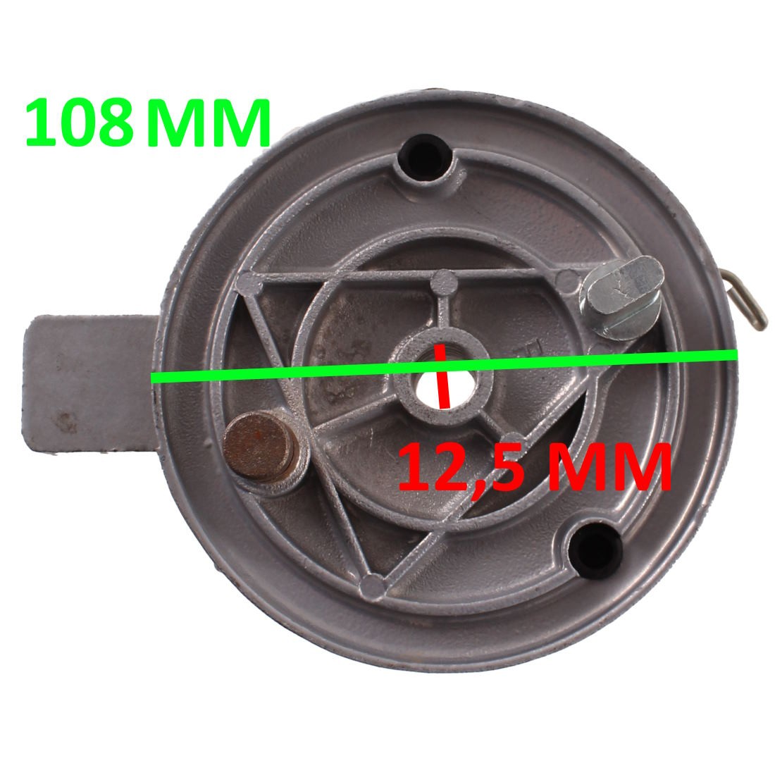 (R.21212) Vendo piatto portaceppi usato della ruota anteriore con freno a tamburo con diametro foro 12,5 mm e diametro esterno 108 mm per ciclomotori vari tipo Fantic Motor , per misure vedere foto