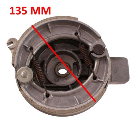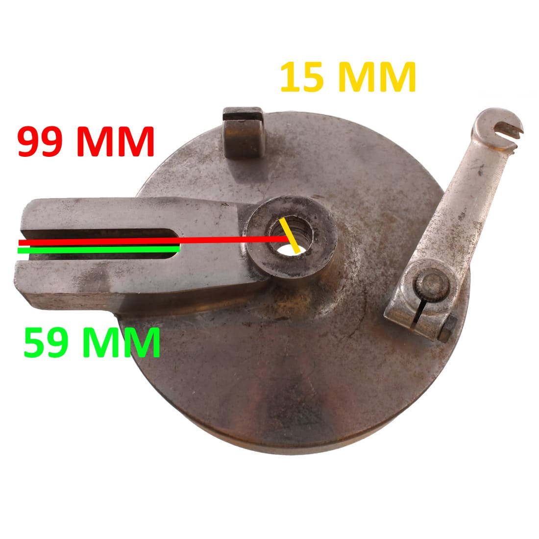 (R.21314) Vendo piatto porta ganasce freno posteriore sinistro usato probabilmente per Fantic Motor con diametro ceppi 135 mm e lunghezza da centro foro a fine innesto 99 mm , con foro centrale da 15 mm e lunghezza innesto 59 mm , per misure vedere foto