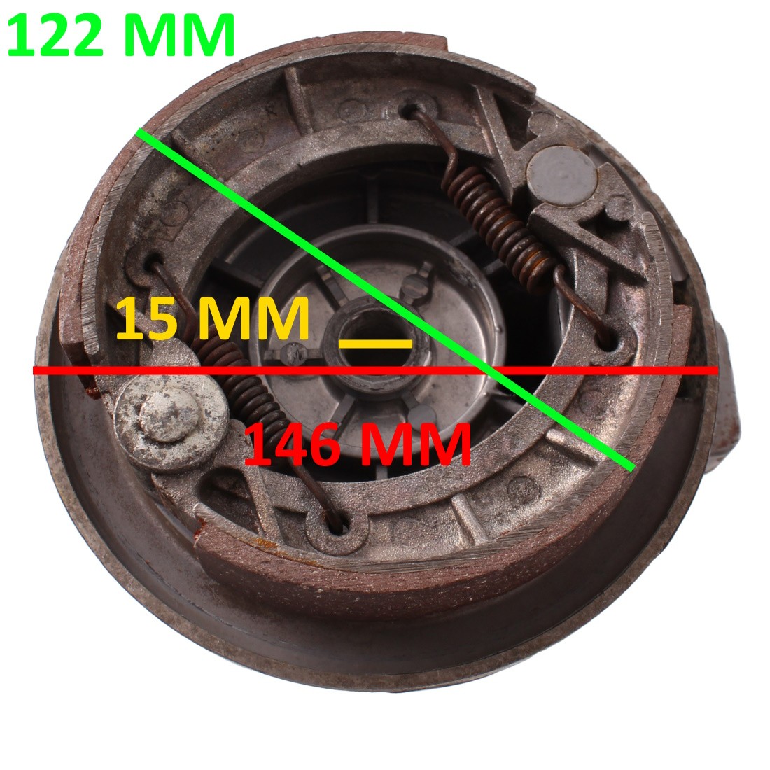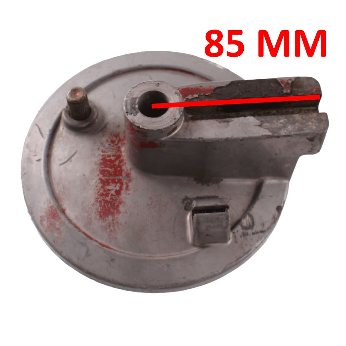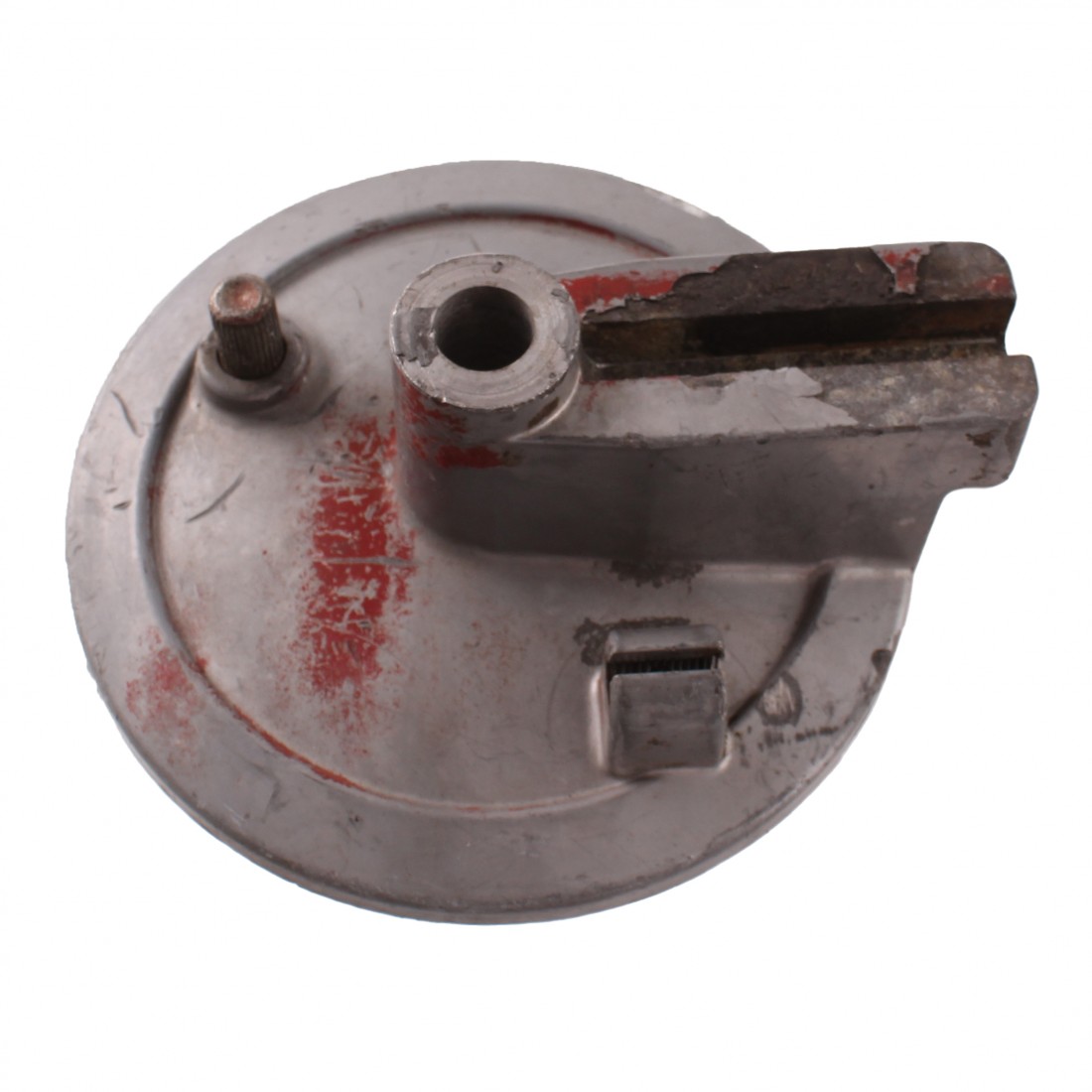 (R.21332) Vendo piatto porta ganasce freno posteriore lato destro usato per ciclomotori e motocicli vari vintage con diametro 146 mm , diametro ceppi 122 mm con foro centrale da 15 mm e interasse foro di innesto da 85 mm , per misure vedere foto