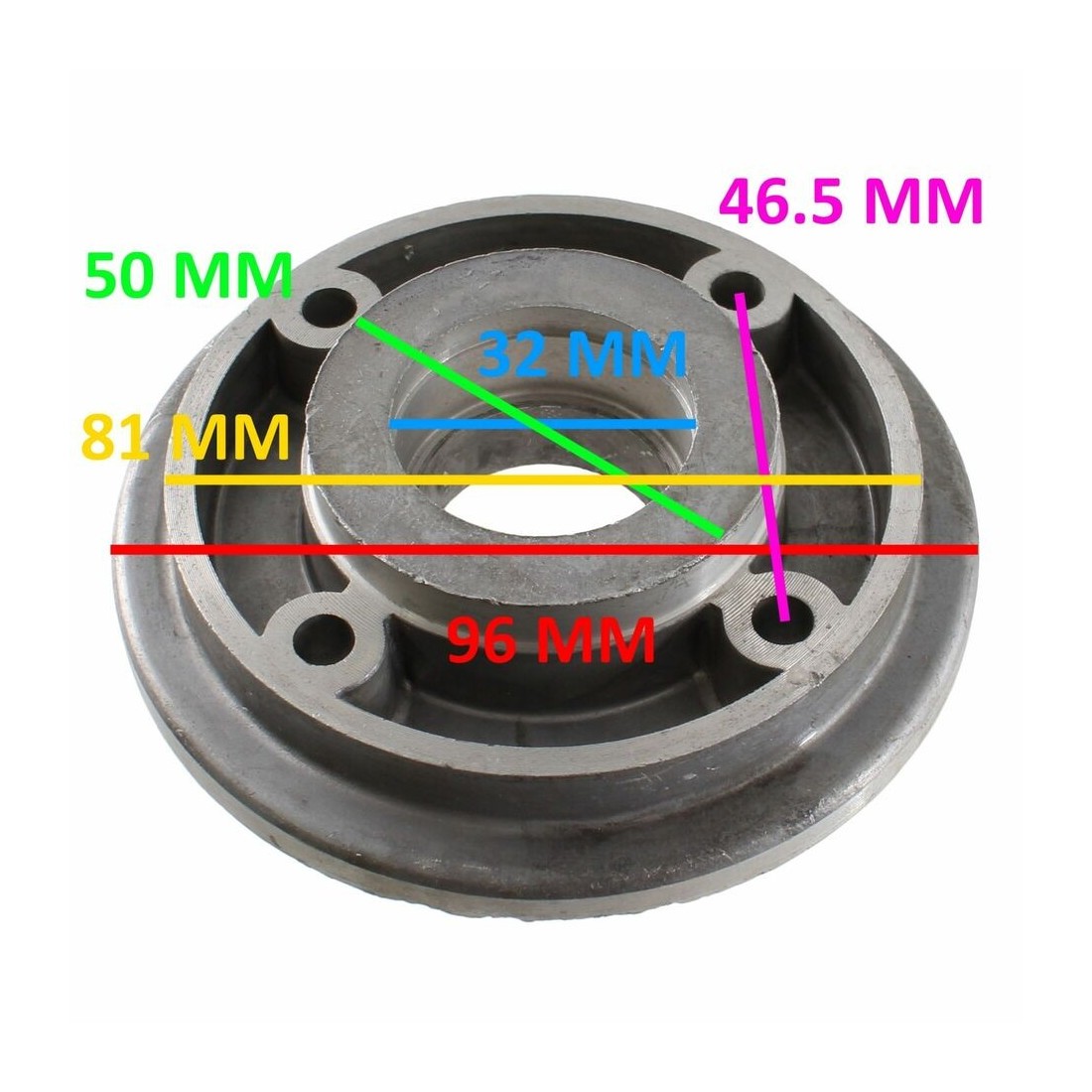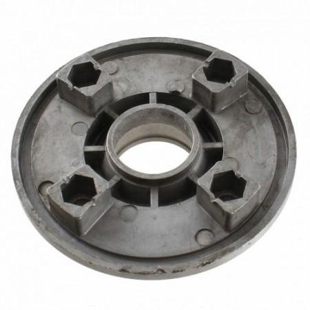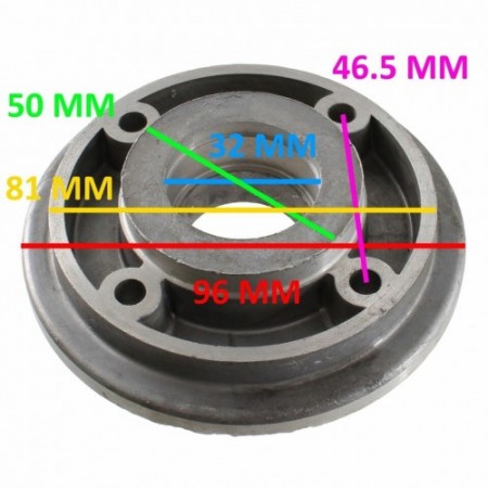 (R.13175) Vendo flangia porta corona e parastrappi con 4 fori fissaggio nuova per ciclomotori vari epoca marca Grimeca con codice 04370 e diametro esterno 96 mm con interasse fori 46.5 mm , per misure vedere foto