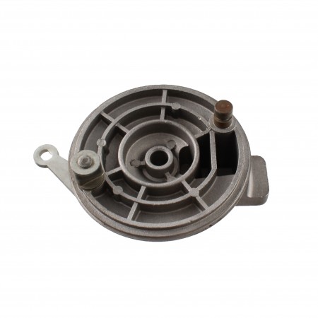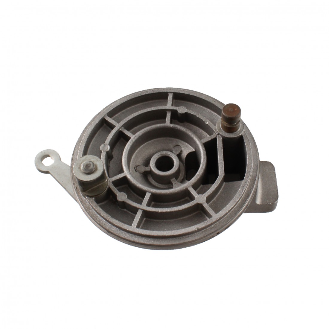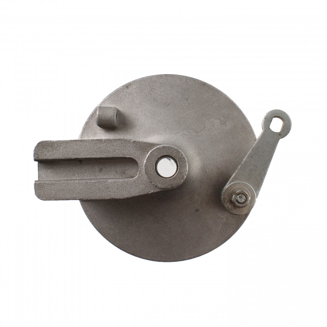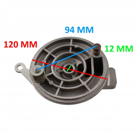 (R.14845) Vendo mozzo portaganasce freno posteriore nuovo per Beta M5 Special anni 80 di colore grigio con diametro esterno 120 mm e diametro foro centrale 12 mm con interasse fori fissaggio ceppi 94 mm , per misure vedere foto