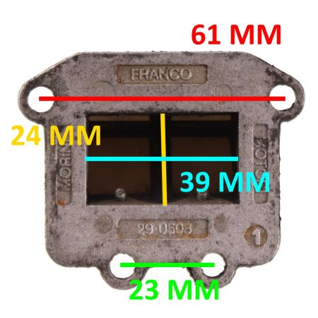 (R.14504) Vendo valvola lamellare usata per Malaguti Fifty Up - Top - Full CX dal 1989 - RST 50 cc dal 1990 - motori Franco Morini G30 - G303 - G304 con codice Malaguti 62009300 e codice Franco Morini 290508 con interasse fori 61 mm e 23 mm , dimensioni foro interno 24 mm x 39 mm , larghezza lamelle 43 mm e altezza 32 mm , per misure e applicazioni vedere foto