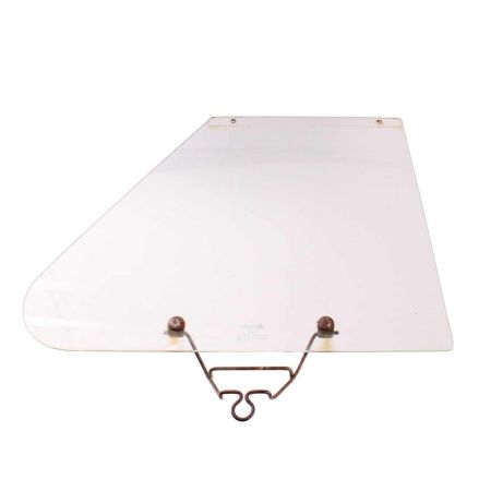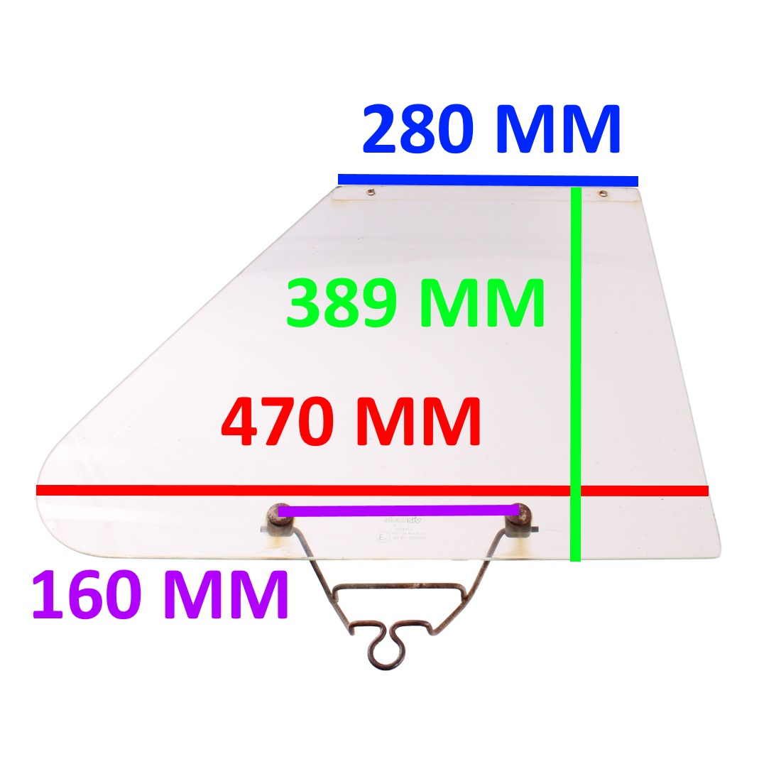(R.24477) Vendo vetro del finestrino usato per Piaggio Ape , lunghezza parte più larga 470 mm , altezza 389 mm , lunghezza parte superiore 280 mm , interasse fori gancio 160 mm , finestrino con gancio inferiore , per misure vedere foto