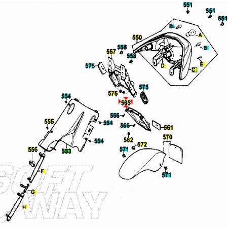 (R.23308) Vendo allungo del parafango posteriore nuovo per Kymco Super 9 50 dal 2000 - Super 9 Sport 50 dal 2003 originale Kymco con codice 00168391 completo di catadiottro originale con codice 00171210 , per applicazioni e spaccato vedere foto