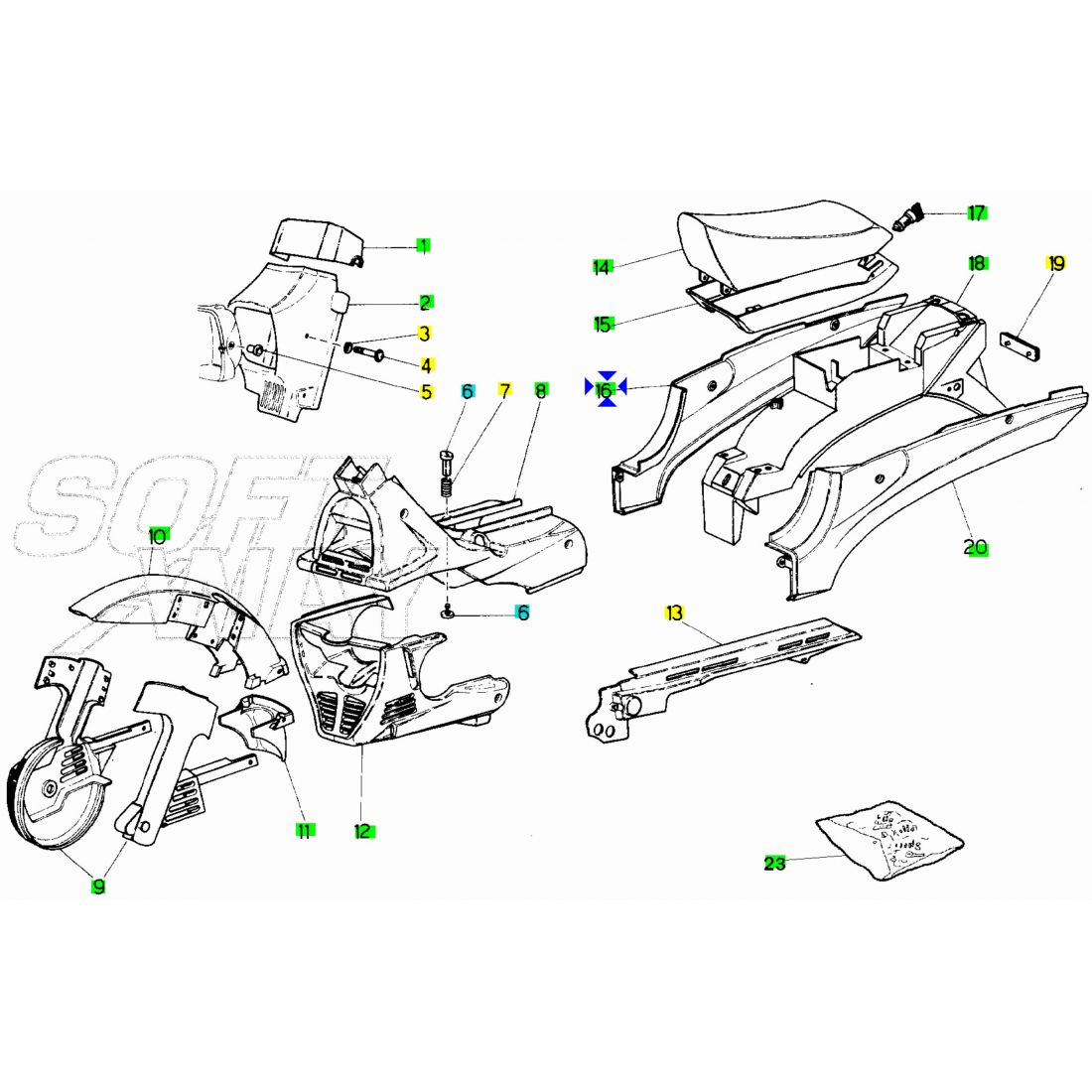 (R.23339) Vendo parafanghi posteriore nuovo con vernice leggermente strisciata come visibile in foto per Malaguti Fifty Full CX dal 1989 originale Malaguti con codice 05603972 di colore bianco , per applicazioni e spaccato vedere foto