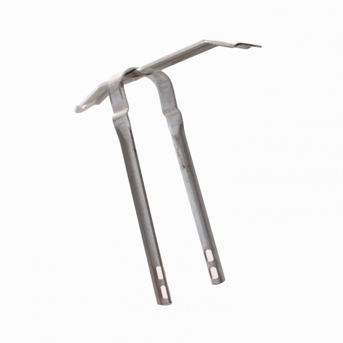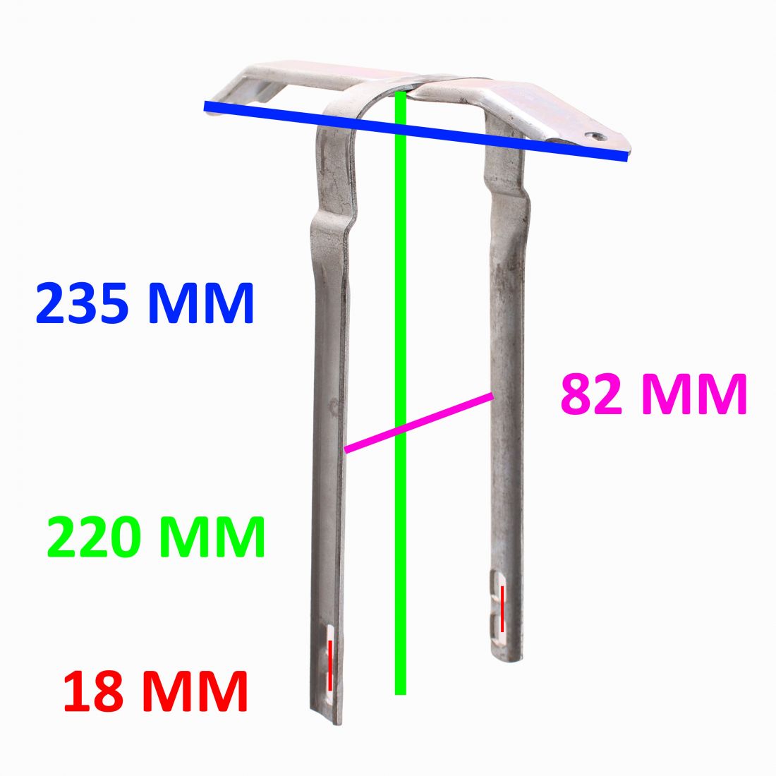 (R. 25048) Vendo supporto nuovo del parafango anteriore per ciclomotori e moto vintage con altezza totale da 220 mm , larghezza da 235 mm , distanza tra le due gambe da 82 mm e interasse fori di fissaggio da 18 mm , per misure vedere foto