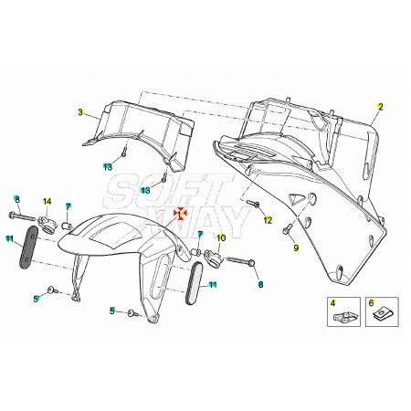 (R. 25257) Vendo parafango anteriore usato per Aprilia SR R Factory 50 cc  - SR 50 cc con codice Aprilia 1B005753 ed ex codice AP8226802 con interasse fori di fissaggio da 237 mm , per misure con applicazioni e spaccato