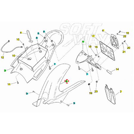 (R.25381) Vendo parafango posteriore copriruota usato per Aprilia RS 50 con codici Aprilia AP8226446 e AP8226765 , per applicazioni e spaccato vedere foto