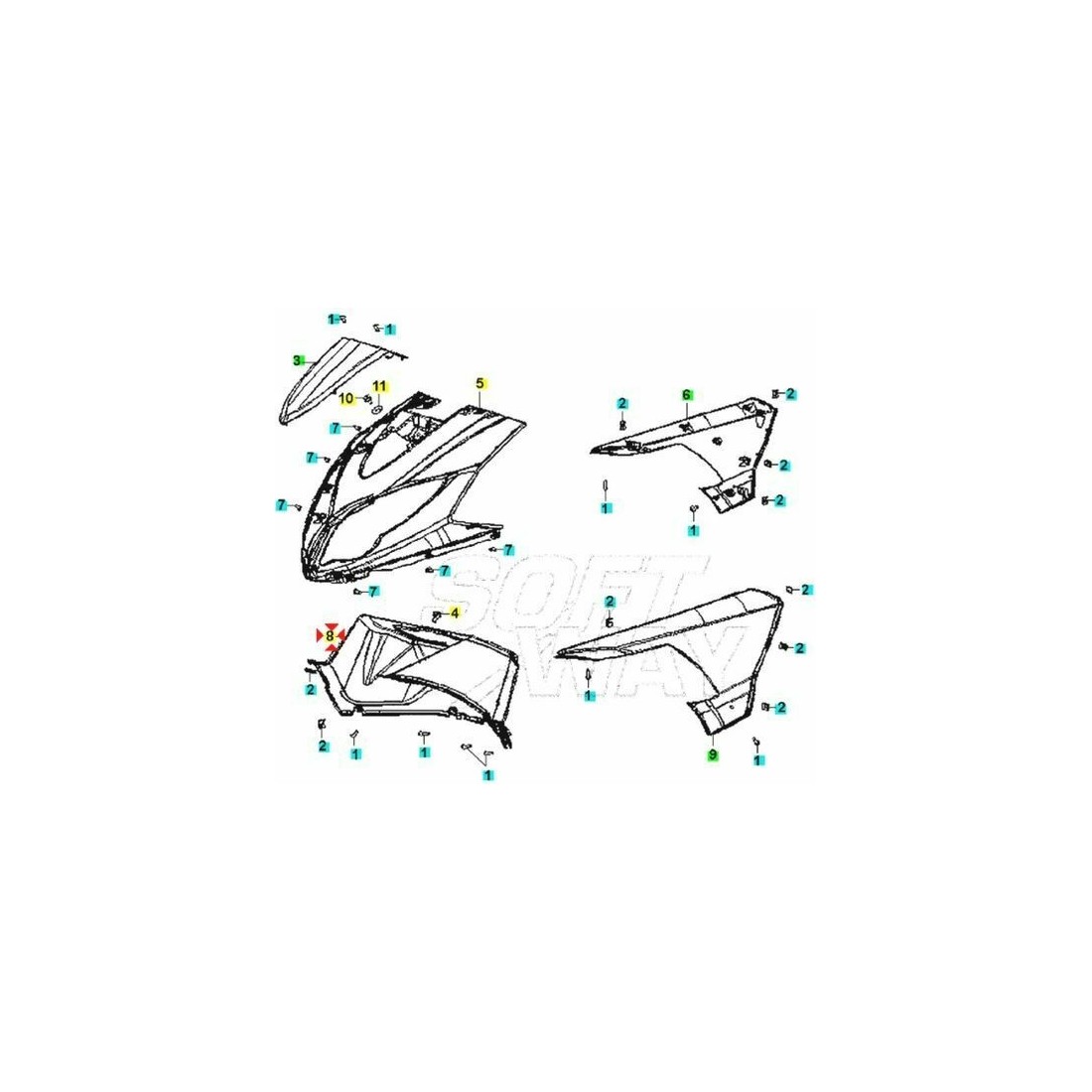 (R.9536) Vendo copertura passaruota usata per Keeway F-Act Evo Sport 50 cc dal 2011 in plastica con codice 65302B590000 , per applicazioni ed esploso vedere foto