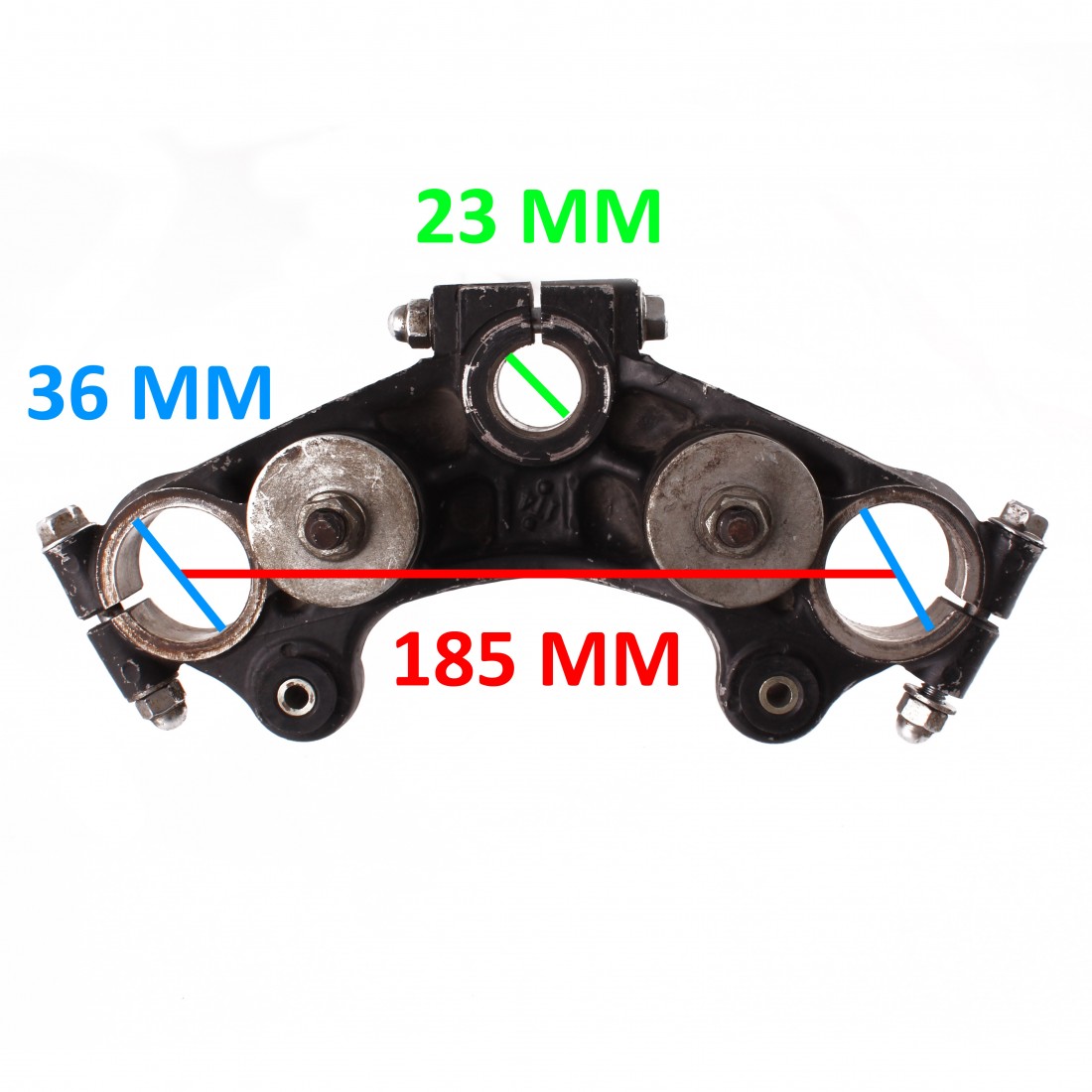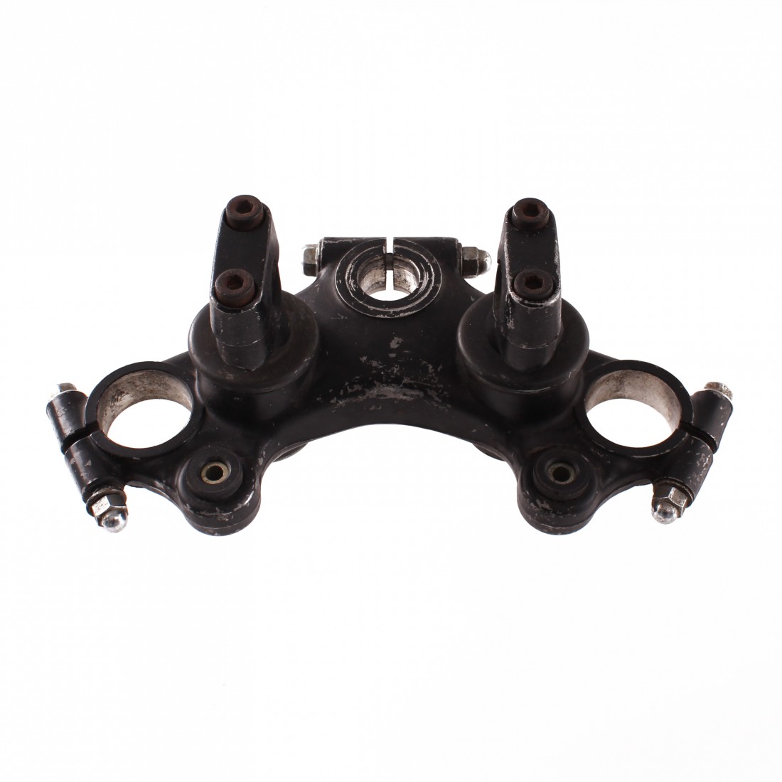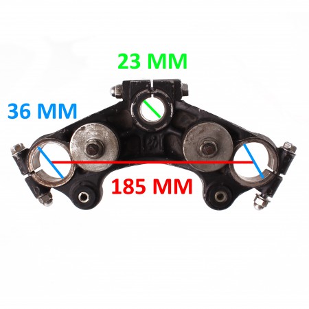 (R.18375) Vendo staffa superiore usata della forcella anteriore per Yamaha XS 750 modello 1T4 e 850 cc dal 1978 con codice 1T4234350000 o 1T4234350198 con diametro fori steli 36 mm e foro canotto 23 mm con interasse fori 185 mm , per misure e applicazioni vedere foto