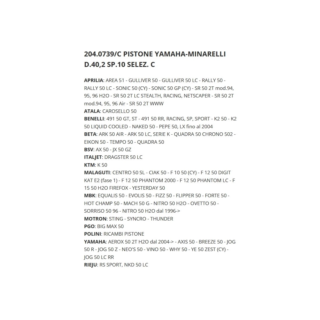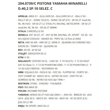 (R.13646) Vendo pistone nuovo con diametro 40.2 mm completo di fasce e spinotto da 10 x 33 mm con tolleranza B per motore Minarelli Orizzontale 50 cc - Aprilia SR - Area 51 - Gulliver - Rally - Sonic - Atala Carosello - VBenelli 491 - K2 - Pepe - Beta Ark - Quadra - Tempo - Italjet Dragster - KTM K - Malaguti Centro - Ciak - F10 - F12 Phantom - F15 Fire Fox - Yamaha Aerox - Neo's - MBK Nitro - Ovetto marca Polini con codice Polini 2040739B , per applicazioni vedere foto