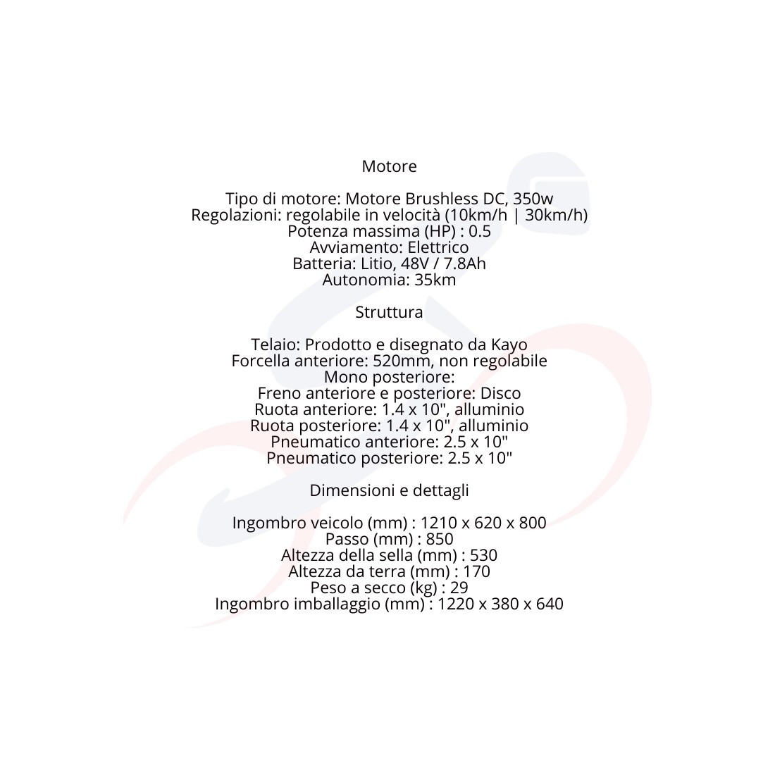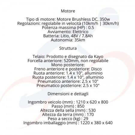 Forti sospensioni anteriori e posteriori , grandi freni a disco , peso ridotto e pneumatici con manopola da 10" offrono al mini crosser buone caratteristiche di guida su piste da motocross più piccole e terreni sconnessi , mentre la batteria al litio aiuta a ridurre il peso e semplifica la maneggevolezza e la guidabilità. Per ulteriori informazioni techniche consultare le foto.