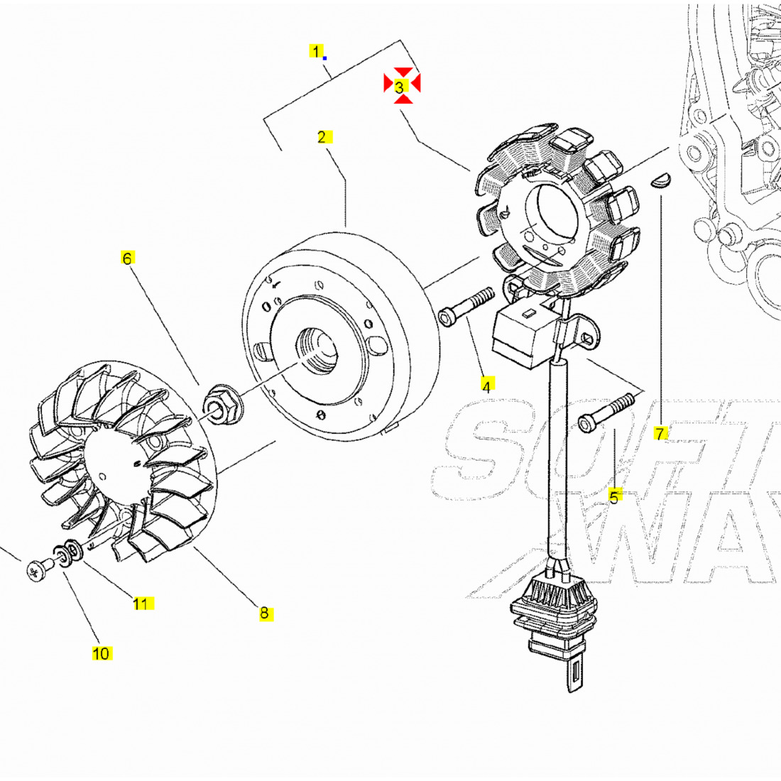 (R.20259) Vendo statore usato per Piaggio Liberty - Vespa LX - Piaggio X8 - Piaggio X9 - Gilera Runner - Derbi Sonar - Derbi Boulevard con motore Leader 125 - 150 - 180 - 200 cc a quattro tempi con codice Piaggio 584690 , per applicazioni e spaccato vedere foto , disponibili più combinazioni :