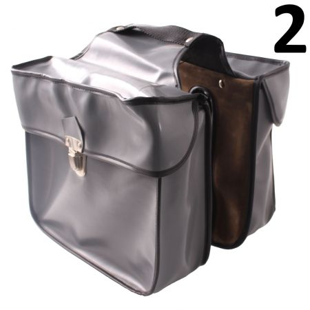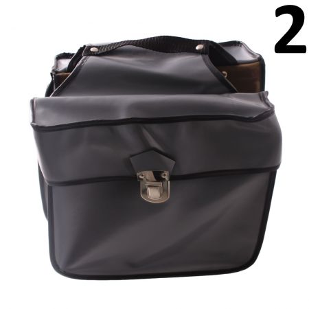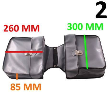- Numero 2 : marca Vestimoto in sky tela cerata , con lunghezza borsa 300 mm e altezza borsa 260 mm con spessore borsa 85 mm di colore grigio con rifiniture di colore nero , euro 60