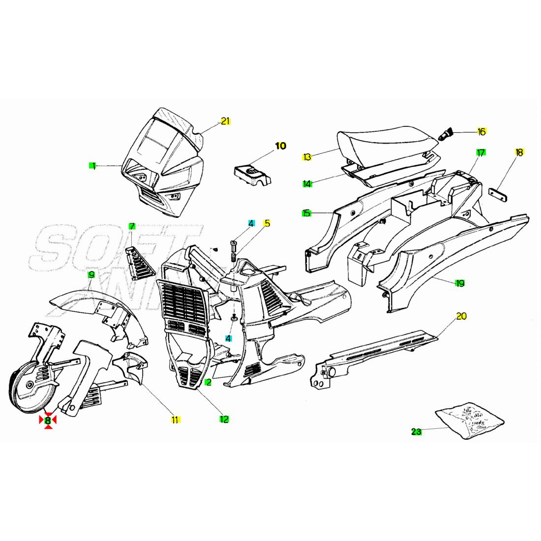 - Numero 4 : di colore rosso con un adesivo con scritta Mix di colore giallo , con diametro interno 238 mm , con codice Malaguti 06306971