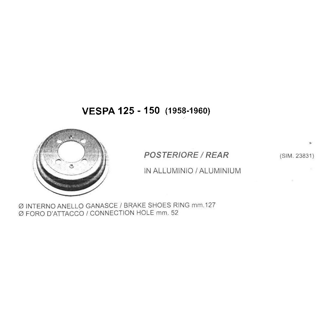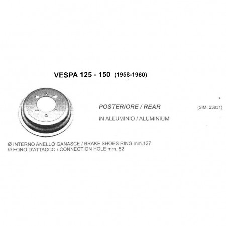 (R.9887) Vendo tamburo freno posteriore in alluminio per Piaggio Vespa 125 e 150 cc dal 1958 al 1960 telaio VNA e VNB con codice Piaggio 023831 e diametro interno ganasce da 127 , il prezzo si intende per singolo pezzo , per misure vedere foto , disponibili più modelli :