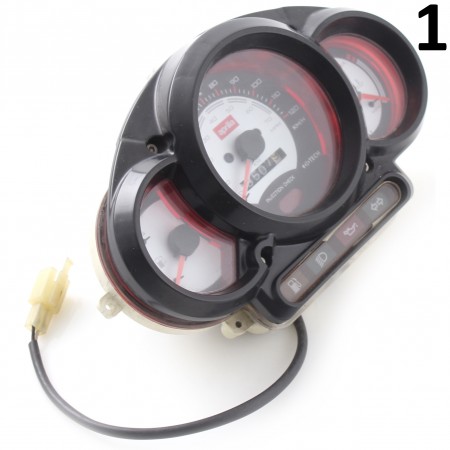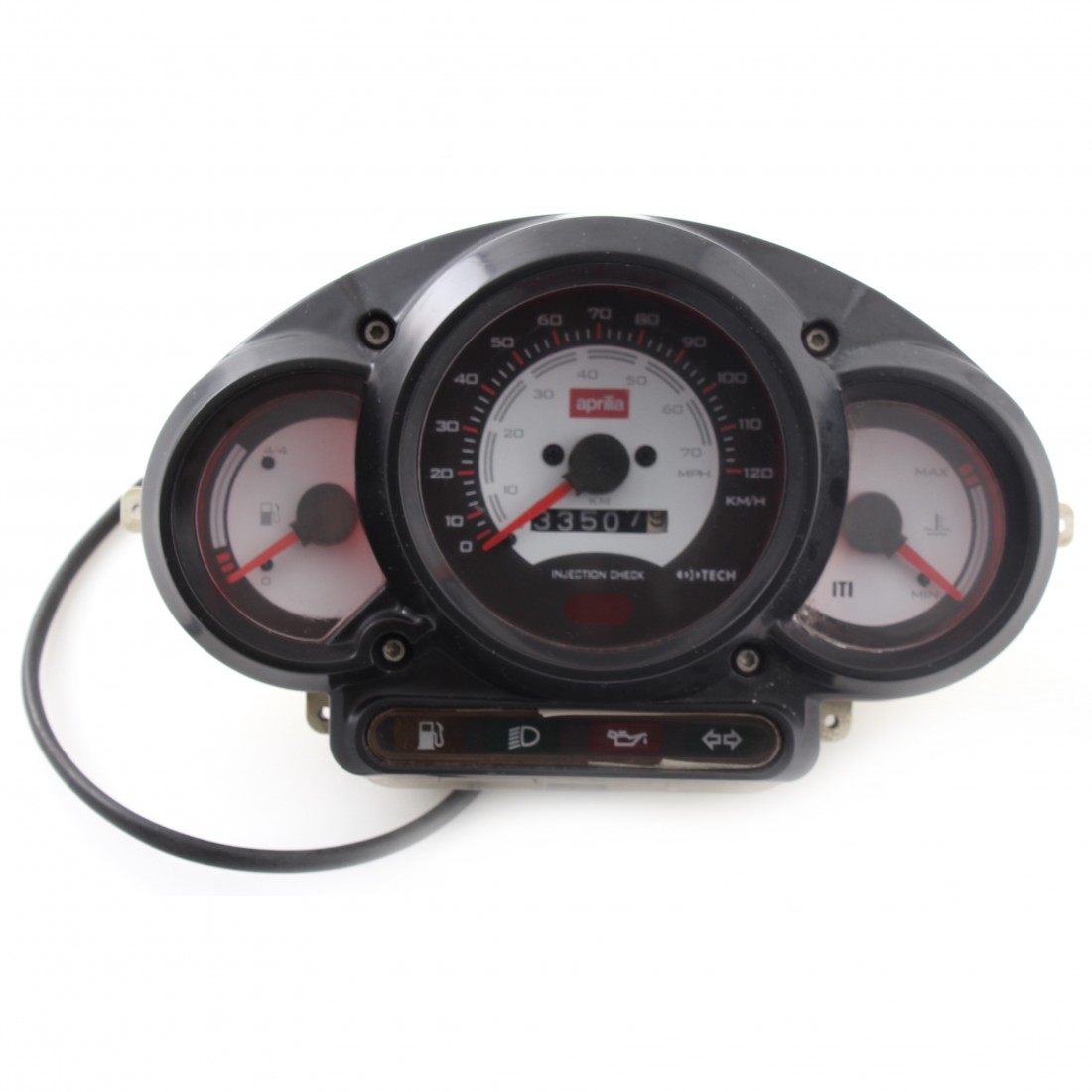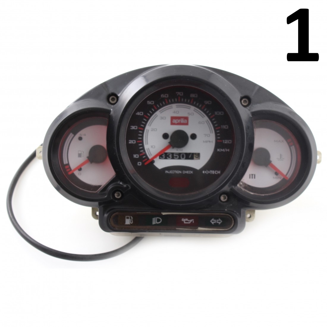(R.7287) Vendo cruscotto completo con gruppo strumenti contakilometri usato per Aprilia solo diteck iniezione 50 cc dal 2000 per telai RCA - RCB - RCF - RLD10 - TE000 - TEA00 con fondo scala 120 km e codice Aprilia AP8224521 - 8224521 - AP8224484 - 8224484 - AP822429 - 822429 , il prezzo si intende per singolo pezzo , per applicazioni vedere foto , disponibili più modelli :