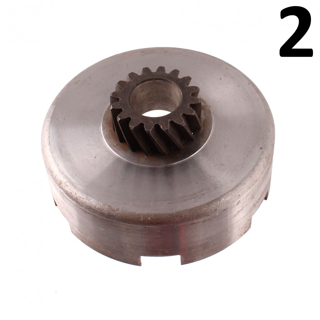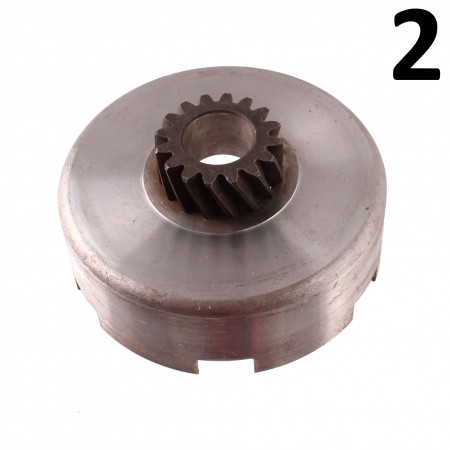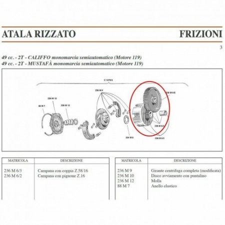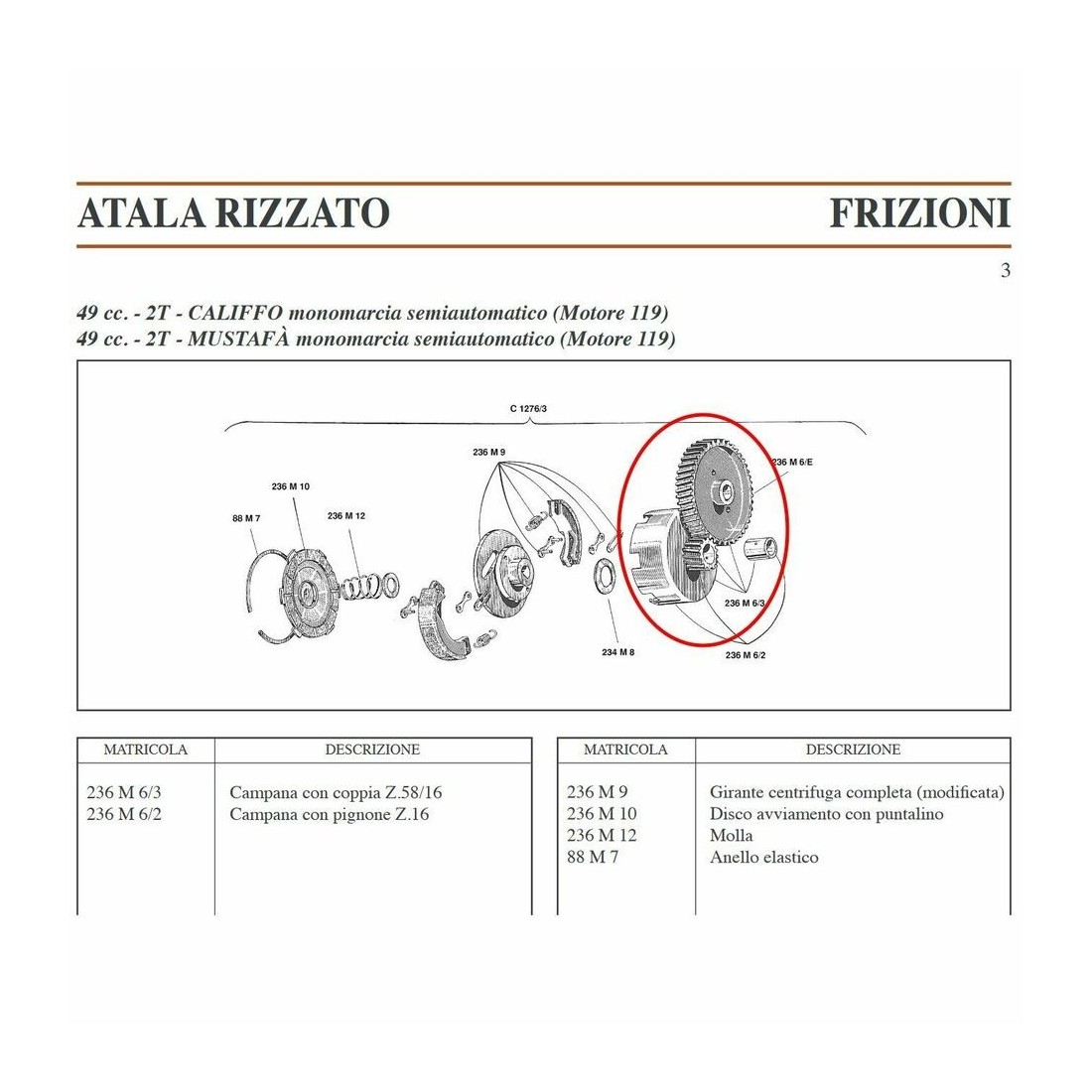 (R.13186) Vendo campana frizione da 16 denti con ingranaggio da 58 denti per Atala Califfo e Mustafa' monomarcia semiautomatico 49 cc con motore Rizzato 119 marchiati Surflex con codice campana completa 236M6/3 o 236 M 6/3 , il prezzo si intende per il singolo modello , per misure con applicazioni ed esploso vedere foto , disponibili più modelli :