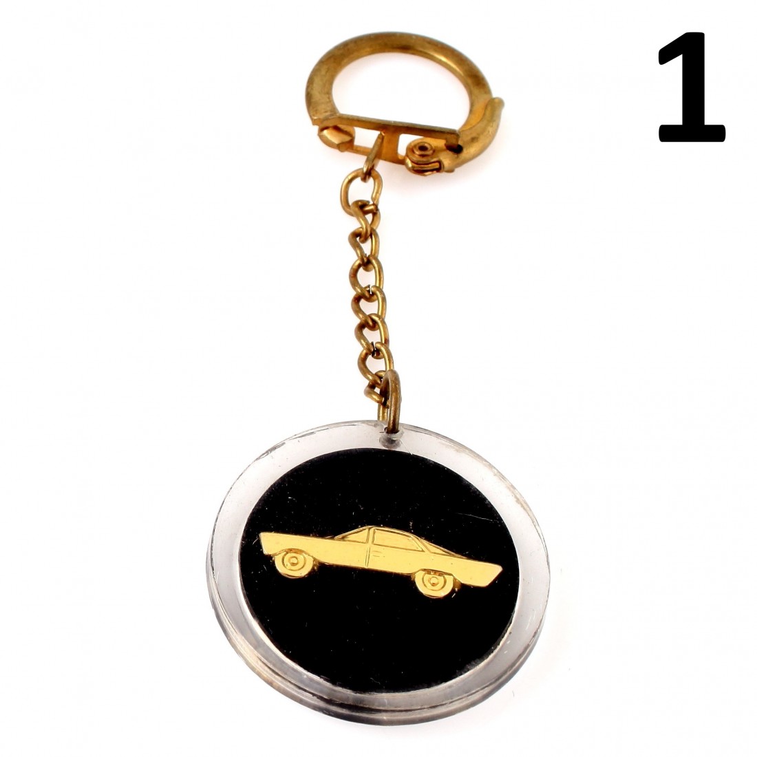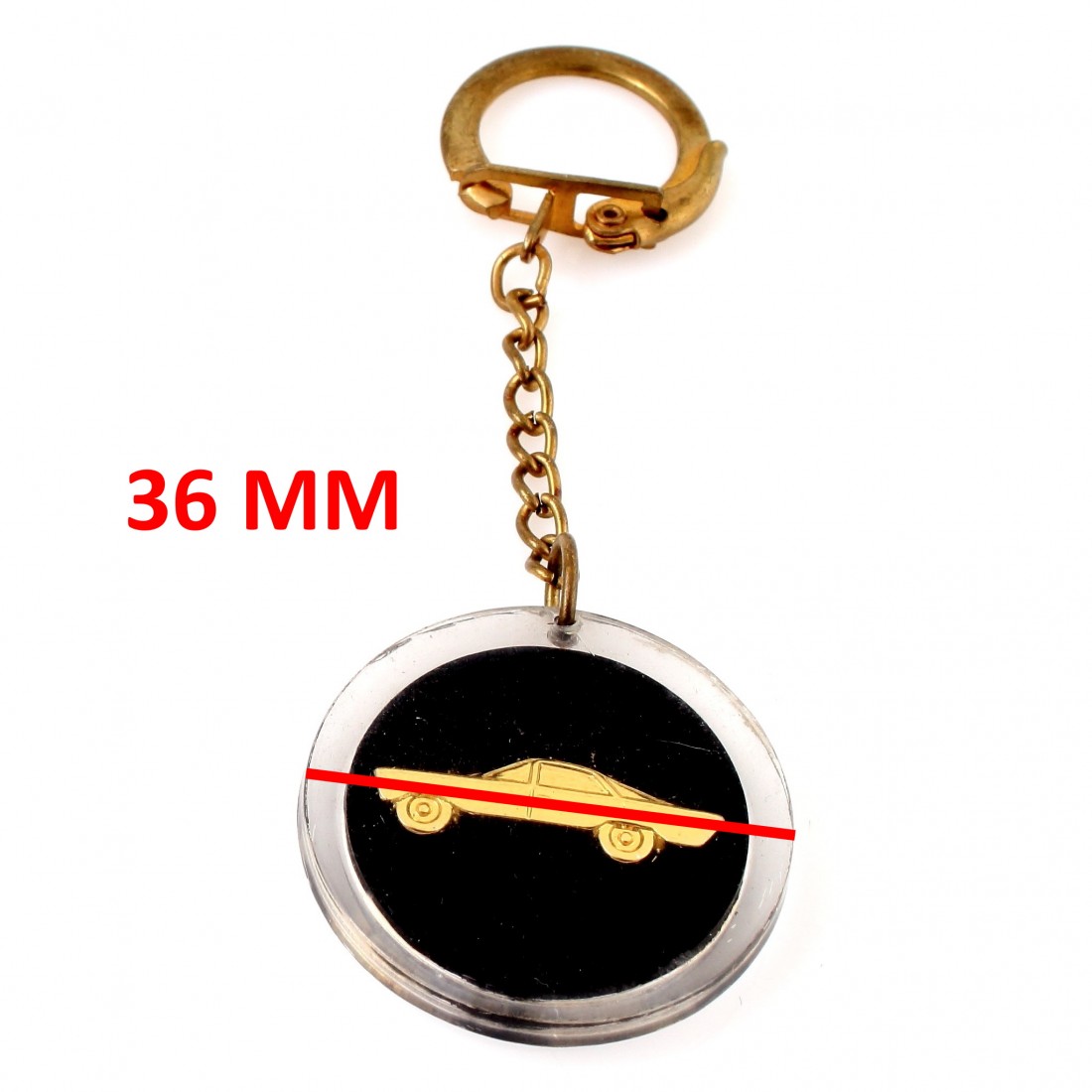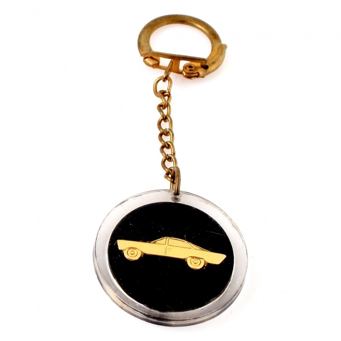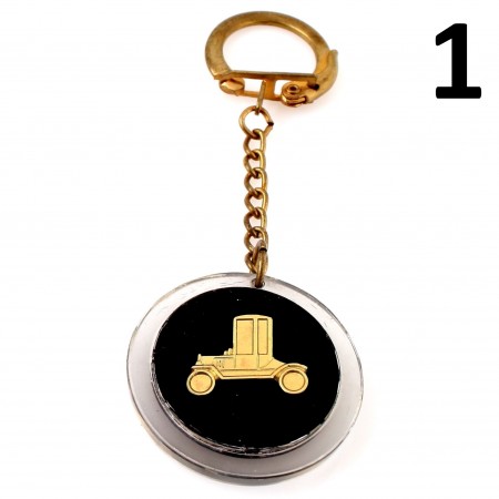 (R.5297) Vendo portachiavi rotondo vintage nuovo anni sessanta e settanta con auto dorata su fronte e retro con diametro 36 mm, il prezzo si intende per singolo pezzo, per misure vedere foto , disponibili più modelli :