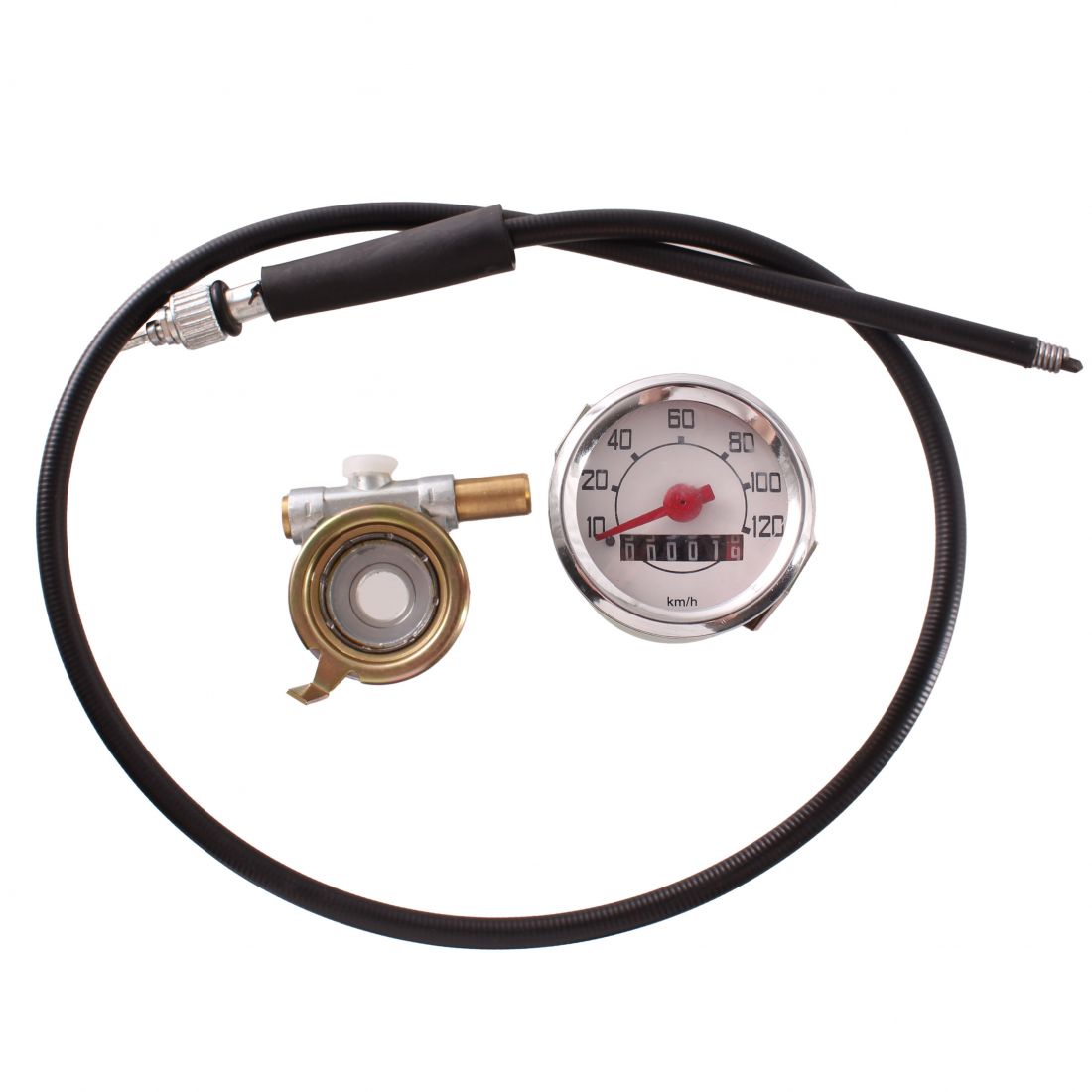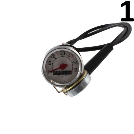 (R.13469) Vendo kit contakilometri nuovo per ciclomotori vari tipo Ciao e altri epoca , completo di trasmissione lunghezza 840 mm e rinvio per ruote sia da 16 che da 17 pollici con scritte nere e sfondo bianco e lancetta rossa , il prezzo si intende per il singolo kit , più modelli disponibili :