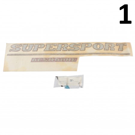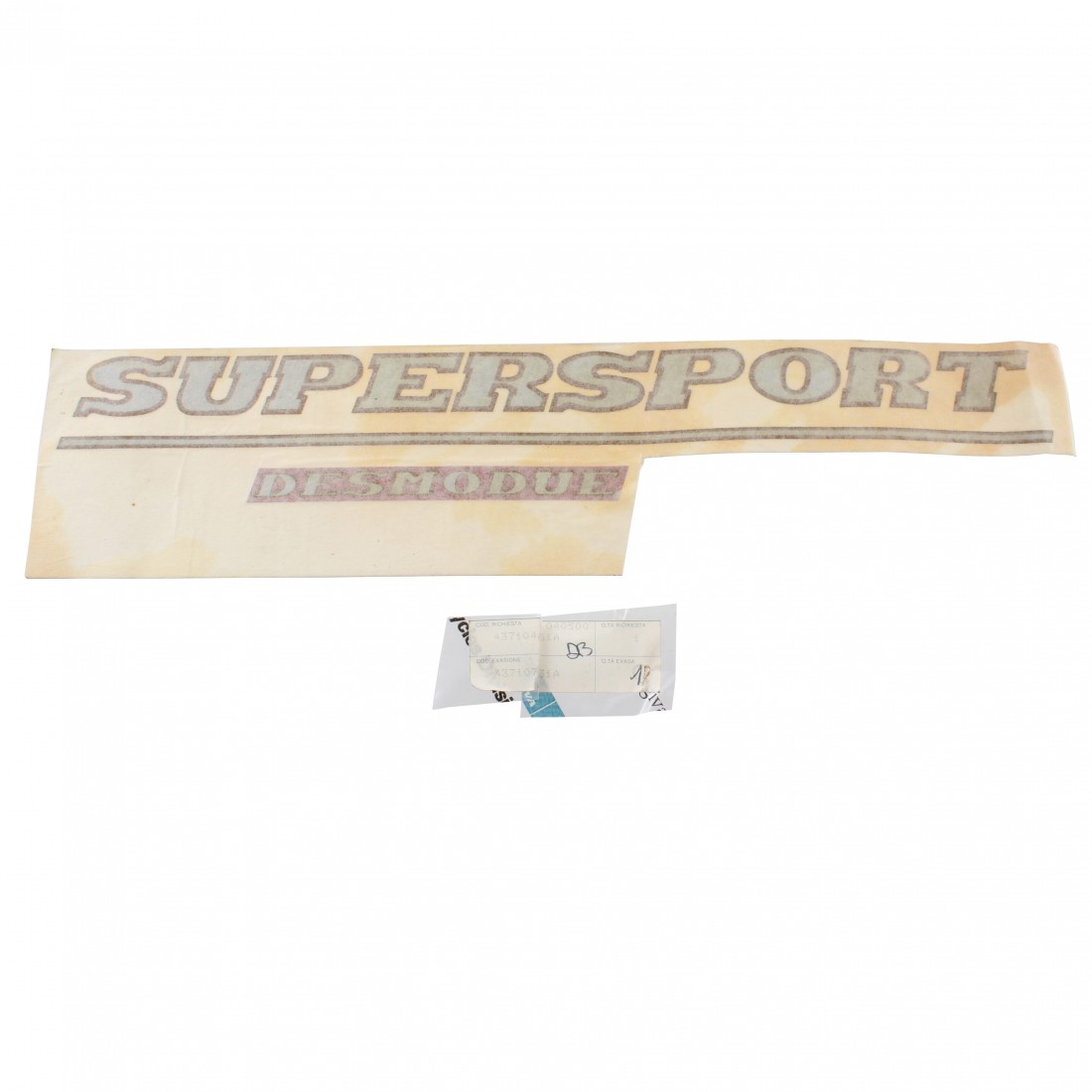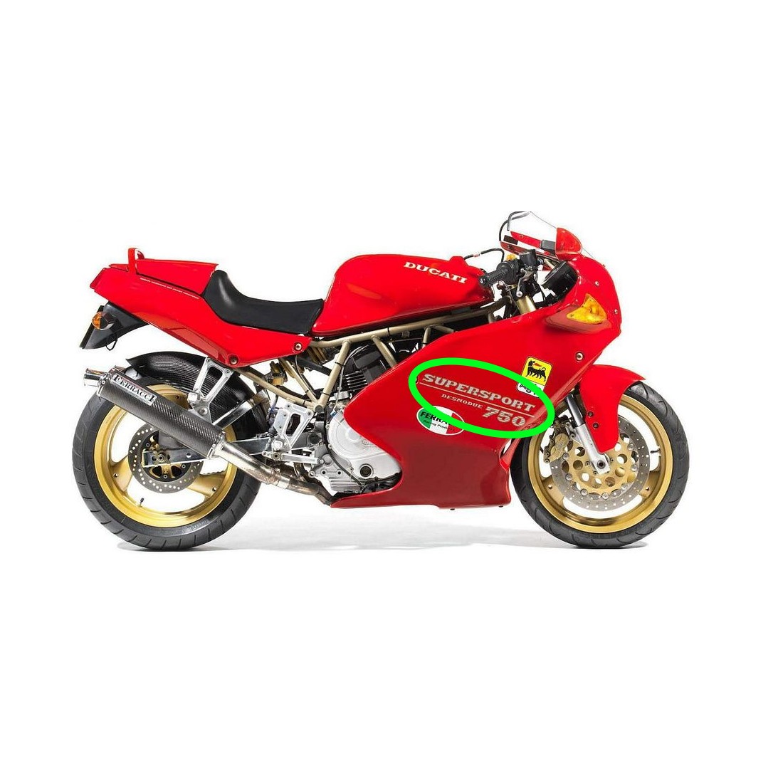 (R.14689) Vendo decalco carena fianchetto laterale destro nuovo per Ducati Supersport SS Desmodue 400 - 600 - 750 - 900 cc dal 1991 con codice 43710731A di colore argento con bordi oro , per misure e applicazioni vedere foto , foto del veicolo solo a scopo dimostrativo , il prezzo si intende per singolo modello , più modelli disponibili :