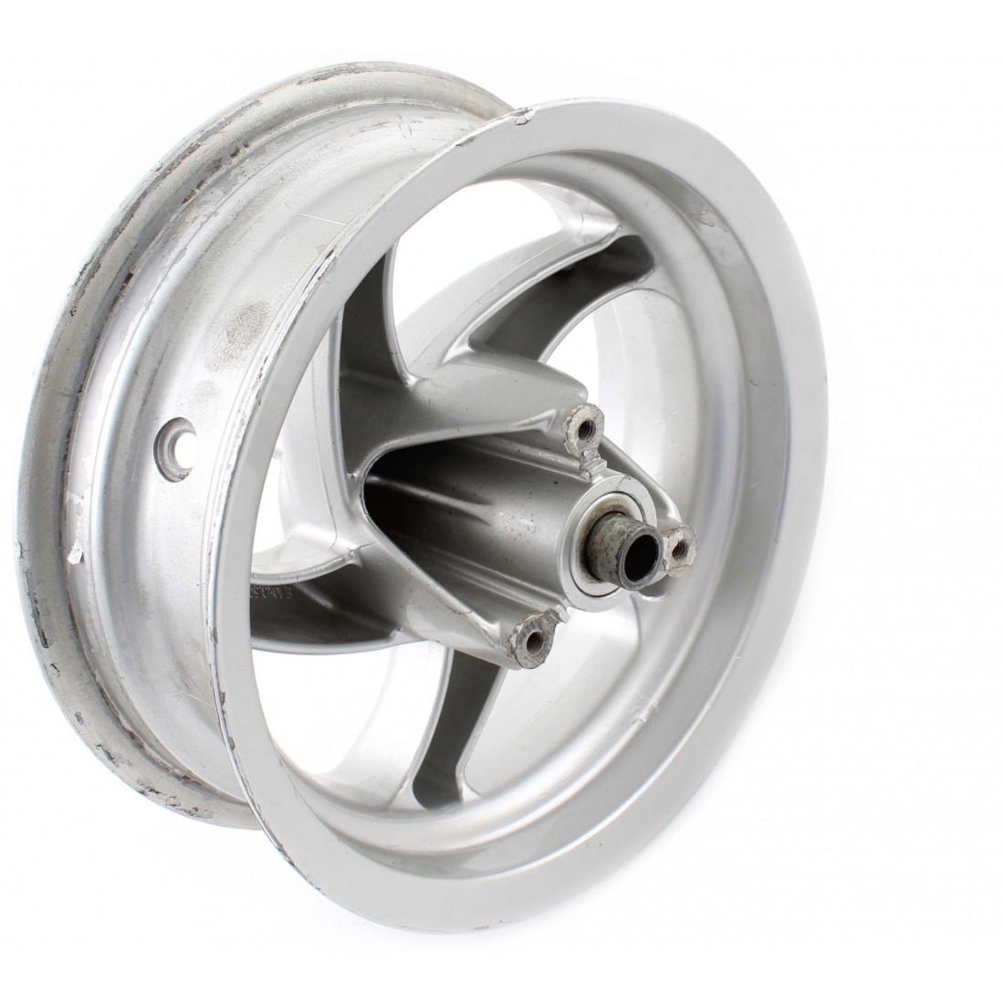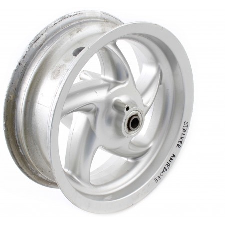 (R.10064) Vendo cerchione anteriore in lega usato per Gilera Stalker 50 cc dal 1997- Piaggio Typhoon 50 cc dal 2001 in lega 10 x 3.50 a 5 razze colore argento con codice 59764300B1 e marchiato E 10 x 3.50 DOT- D , il prezzo si intende per singolo pezzo , per applicazioni vedere foto
