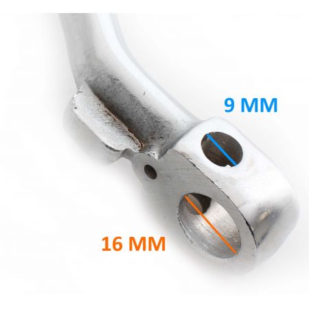 (R.9055) Vendo leva messa in moto destra cromata nuova per ciclomotori epoca generici versione con chiavella con diametro foro perno da 16 mm e foro chiavella da 9 mm , per misure vedere foto