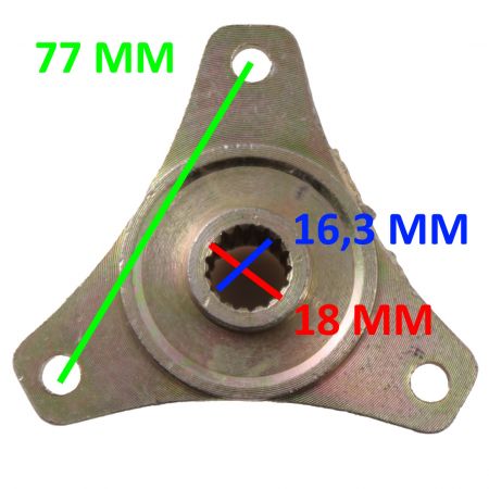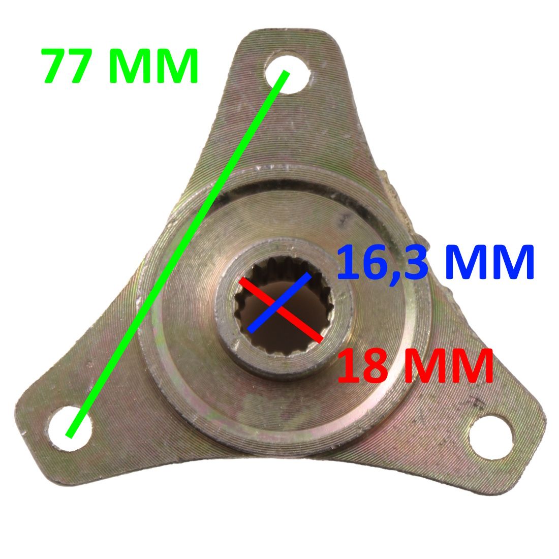 (R.23403) Vendo flangia dell'asse posteriore nuova per miniquad con diametro interno denti 16,3 mm e diametro punta dei denti 18 mm con interasse fori di fissaggio 77 mm , per misure vedere foto