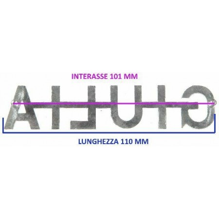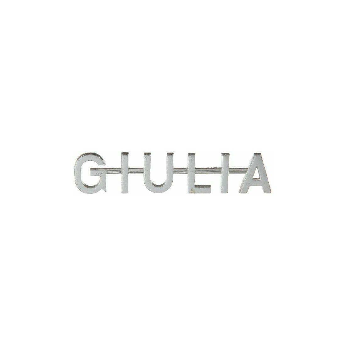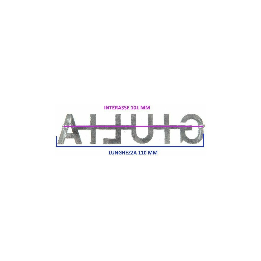 (R.5686) Vendo fregio stemma nuovo per auto Alfa Romeo Giulia originale epoca scritta piatta in metallo cromato con interasse fori di fissaggio 101 mm e lunghezza 110 mm , per misure vedere foto