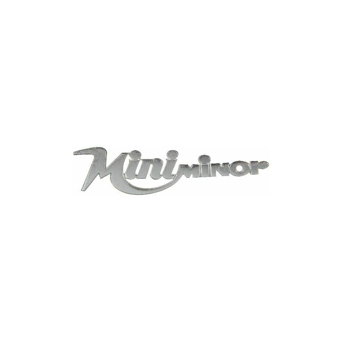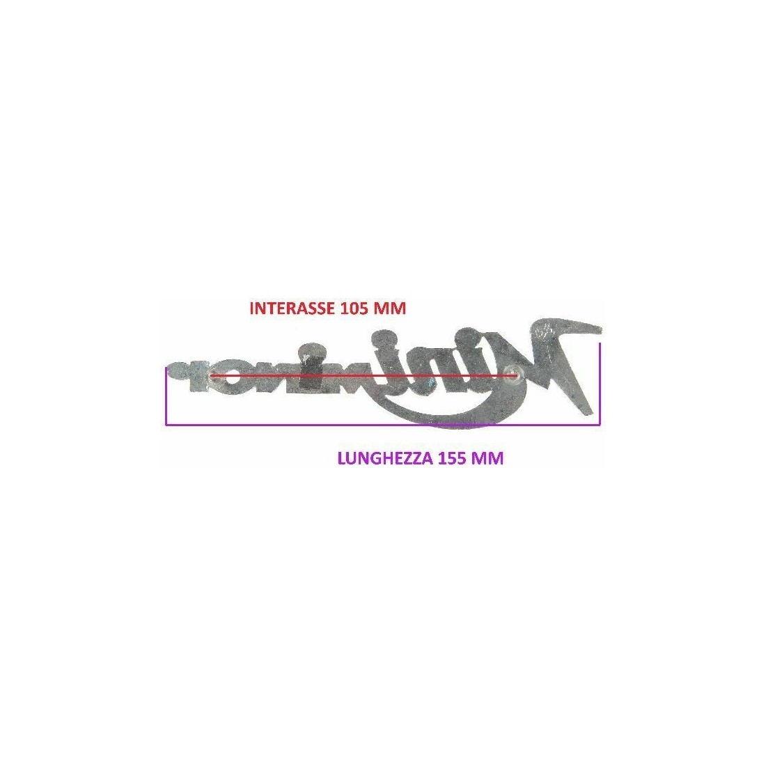 (R.5691) Vendo fregio stemma nuovo per auto Mini minor originale epoca in metallo cromato con interasse fori di fissaggio 105 mm e lunghezza 155 mm , per misure vedere foto